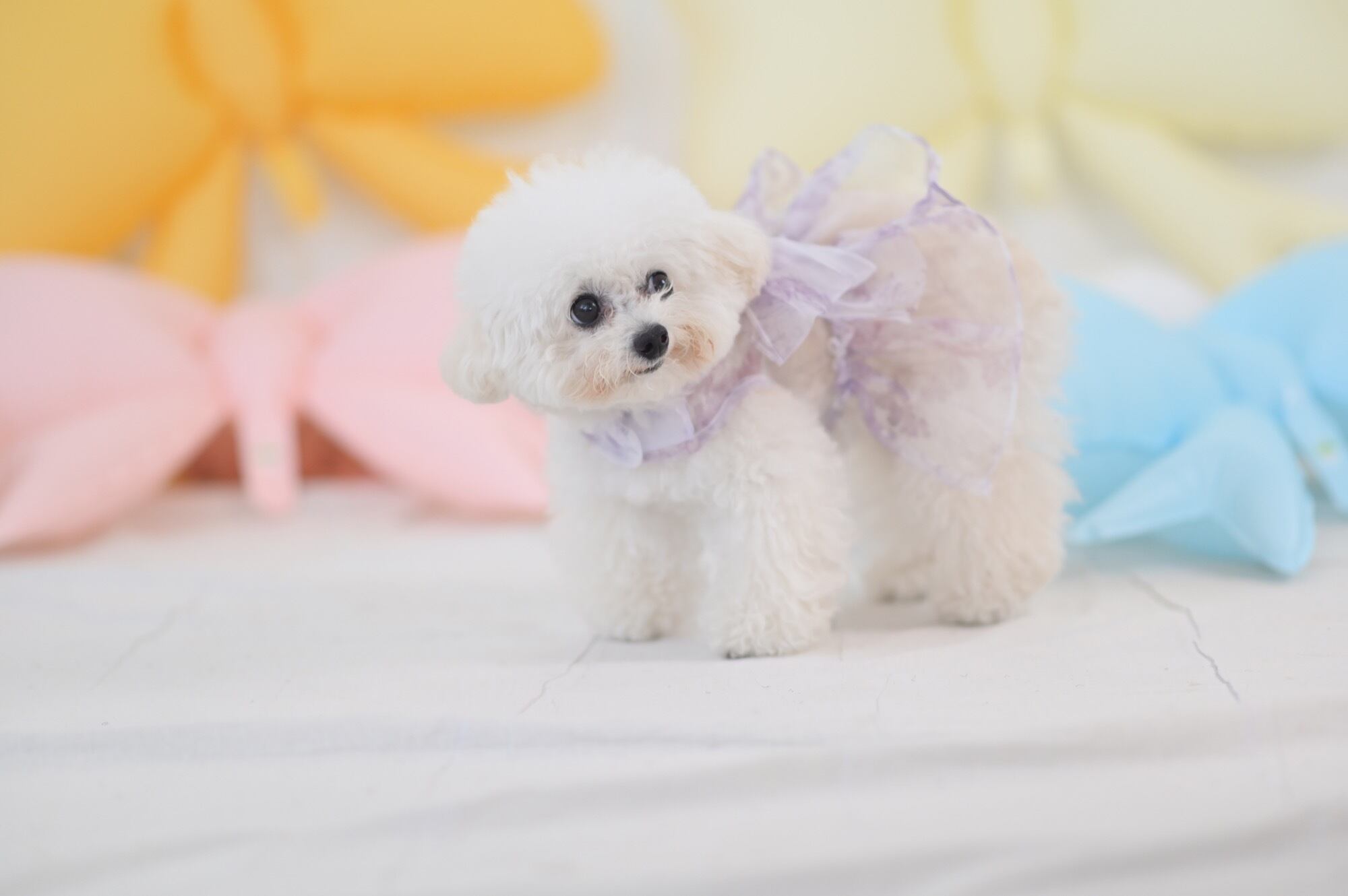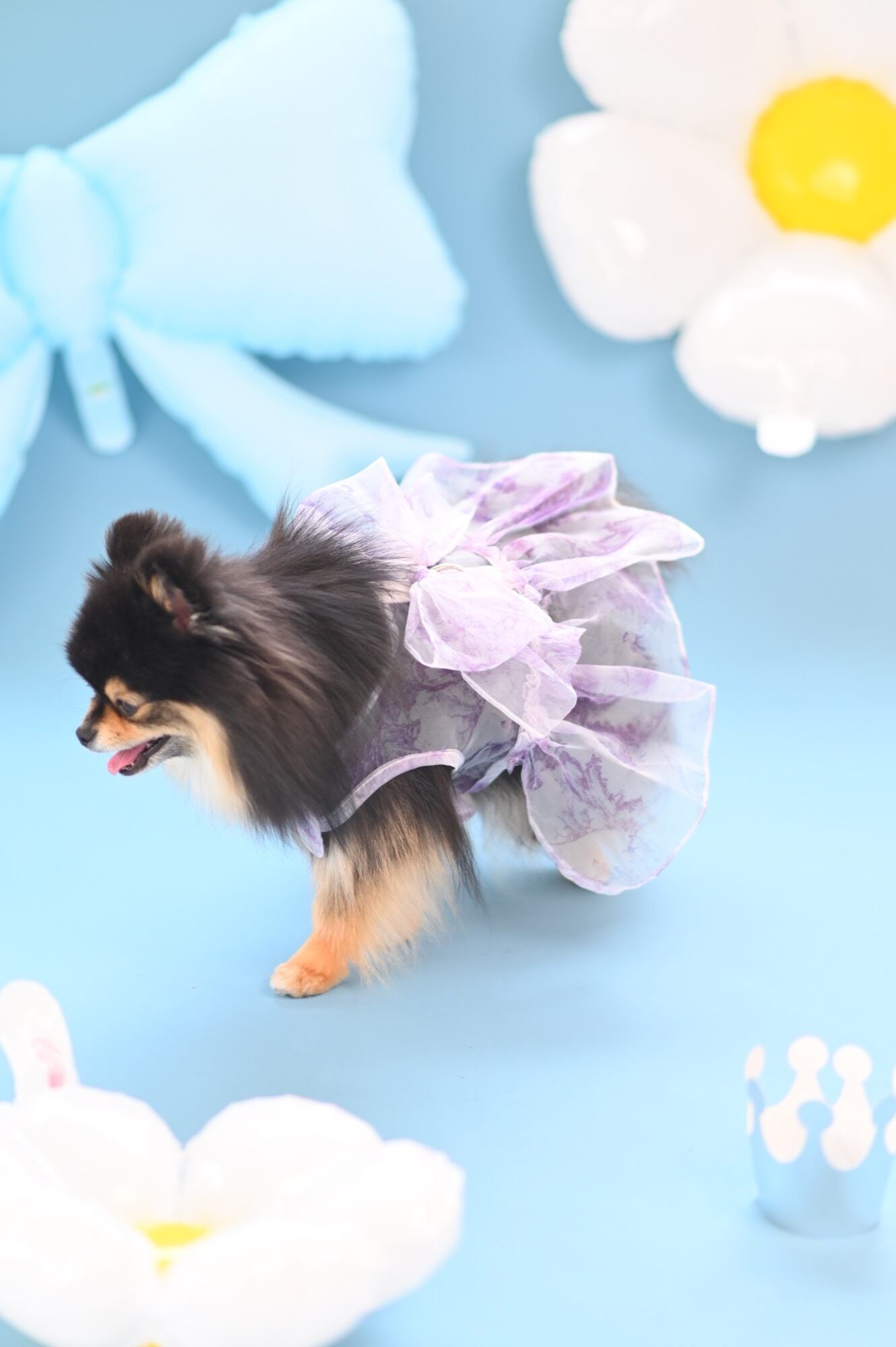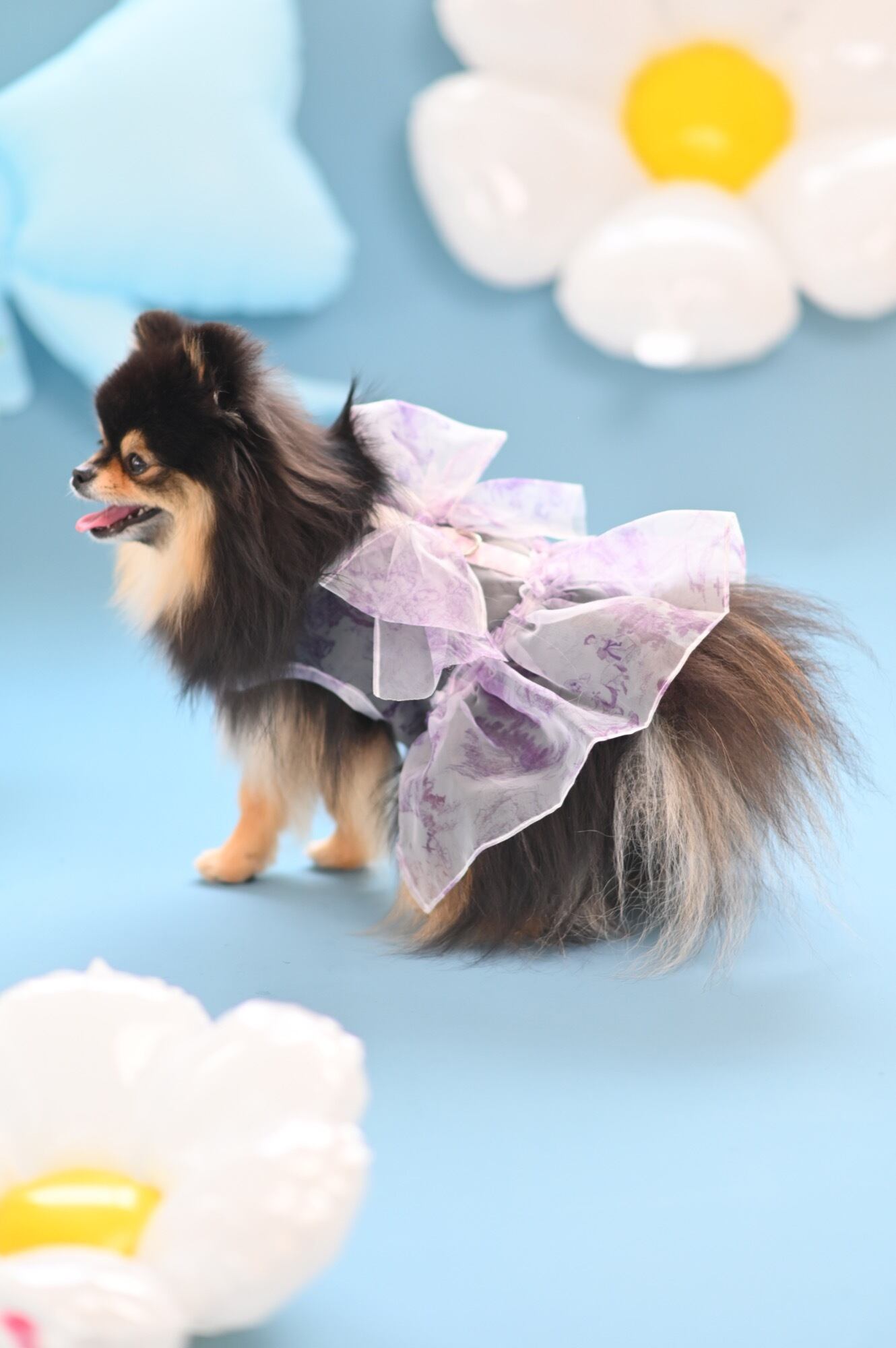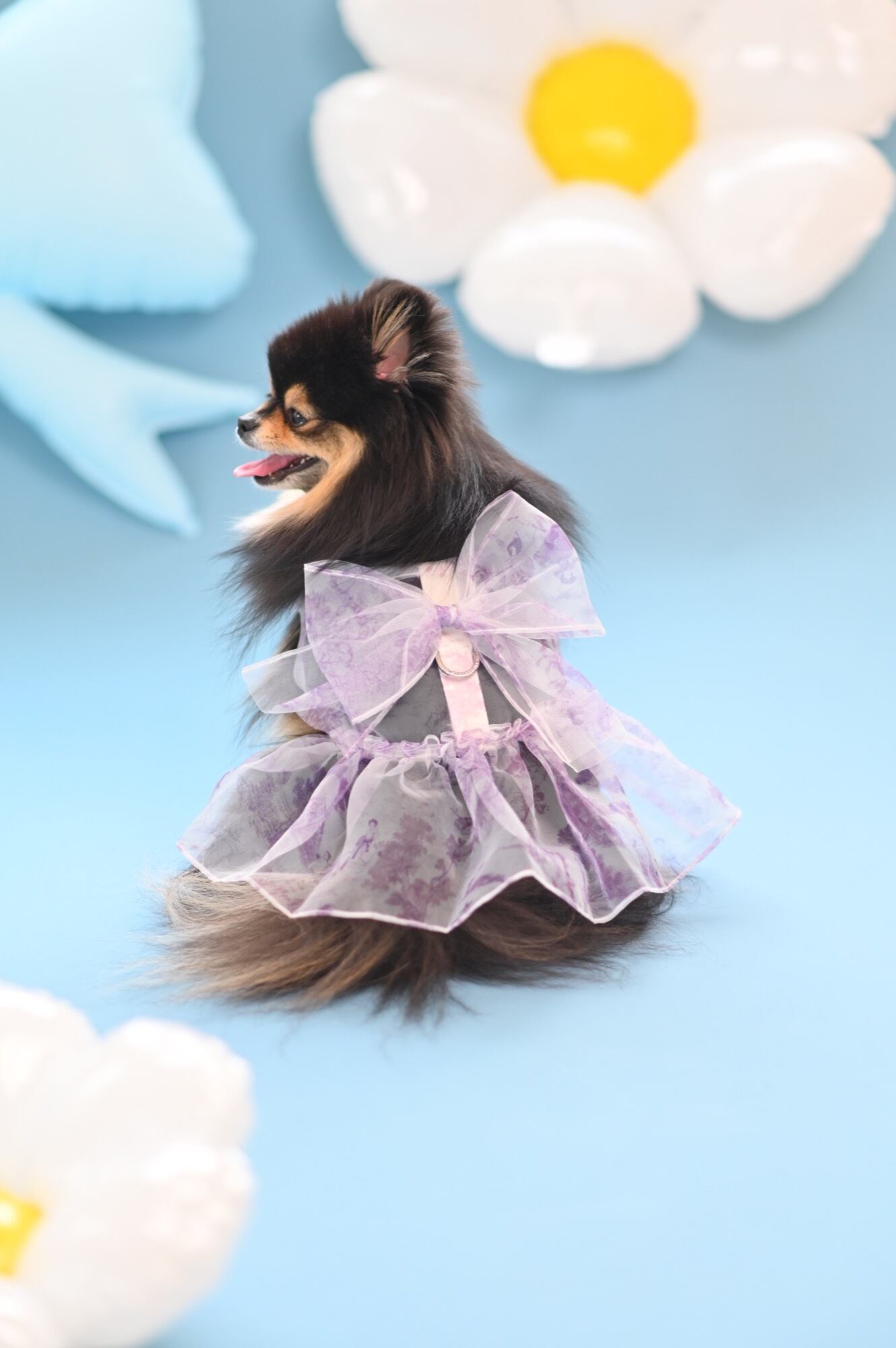 歩くたびに風に揺れてとびきり可愛らしく、特に上品なパープルカラーは気品を漂わせ、愛犬の魅力をより一層引き立てます。