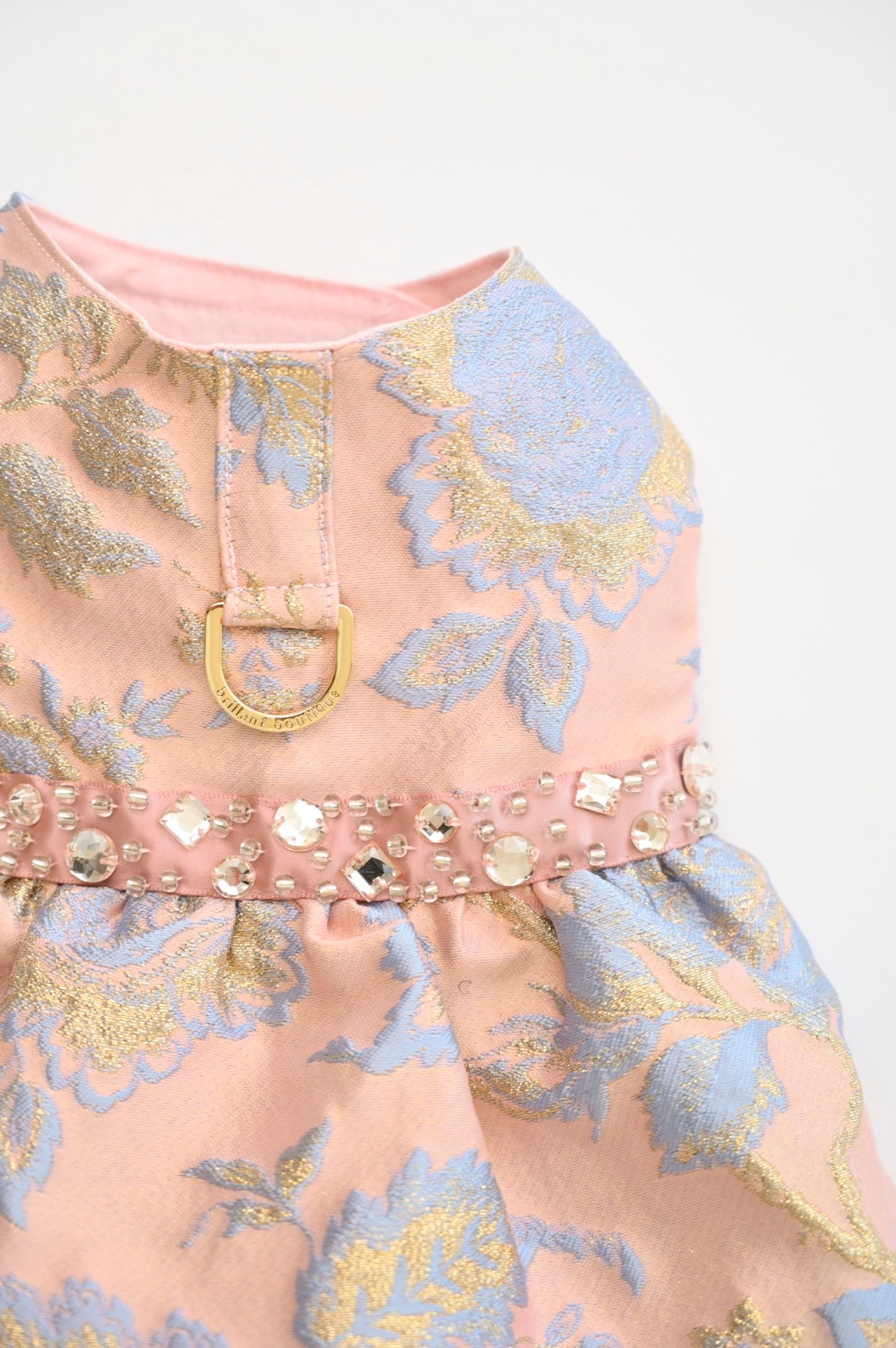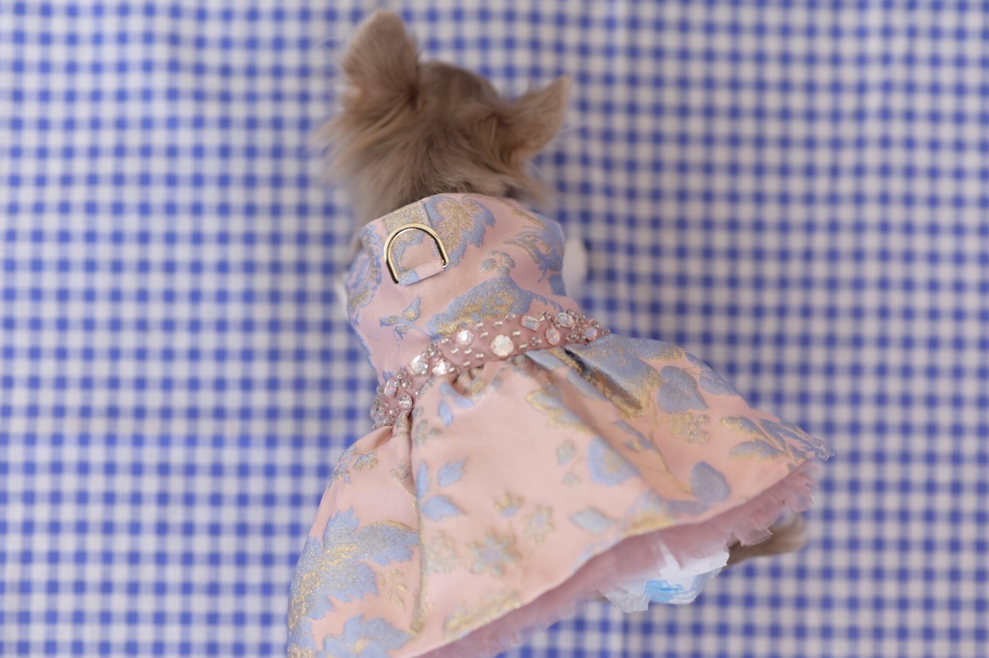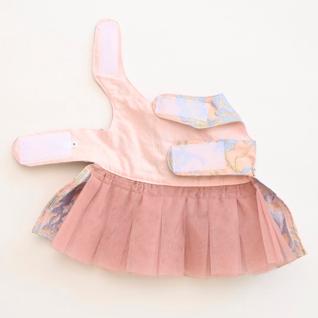 しっかりとしたサテン素材のスカートの下に、ふんわり軽やかなチュールを重ねた愛犬用ハーネスは、見た目の可愛らしさだけでなく、上品さも兼ね備えています。