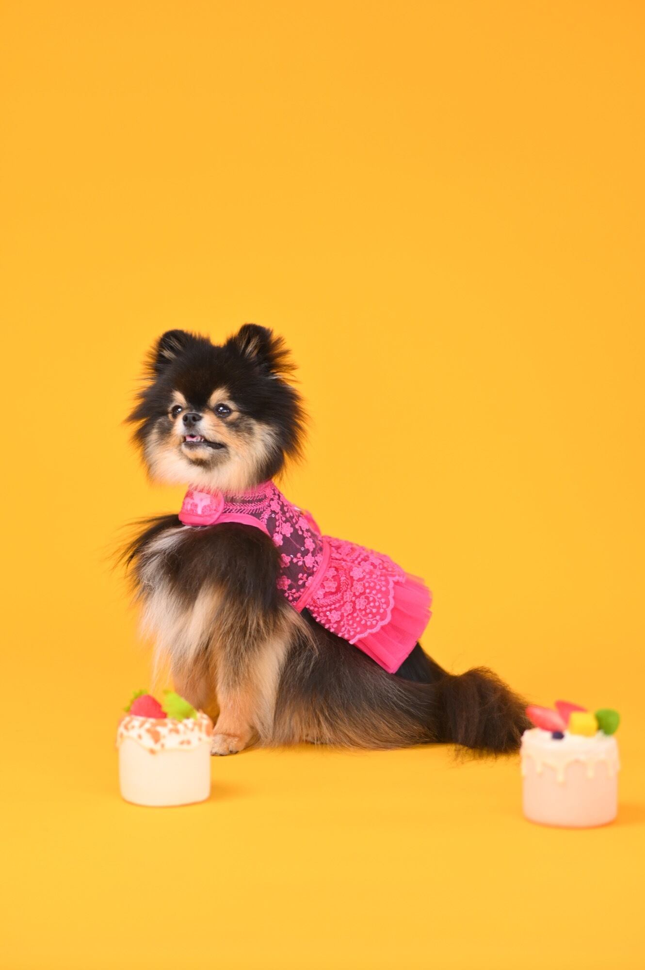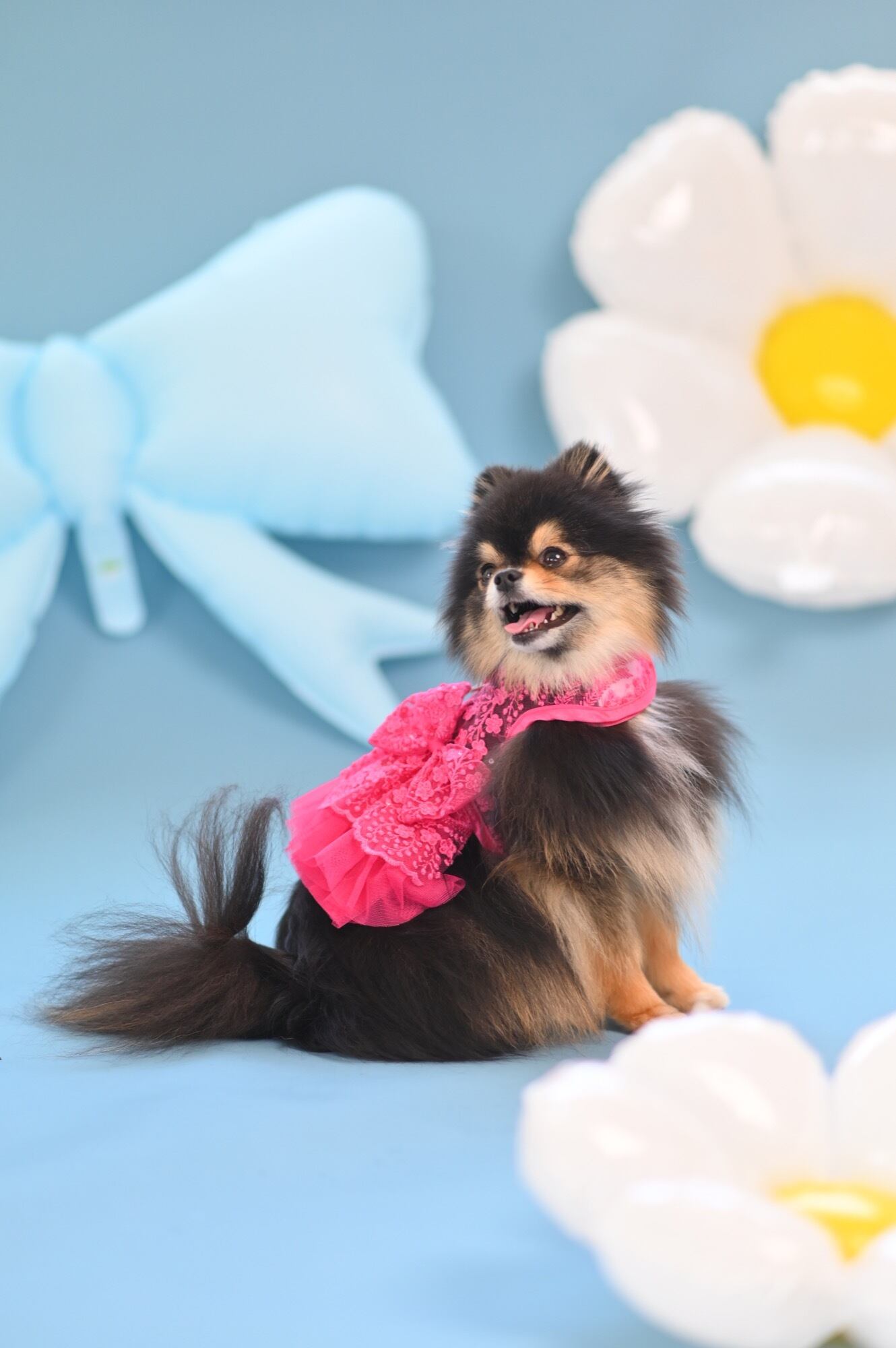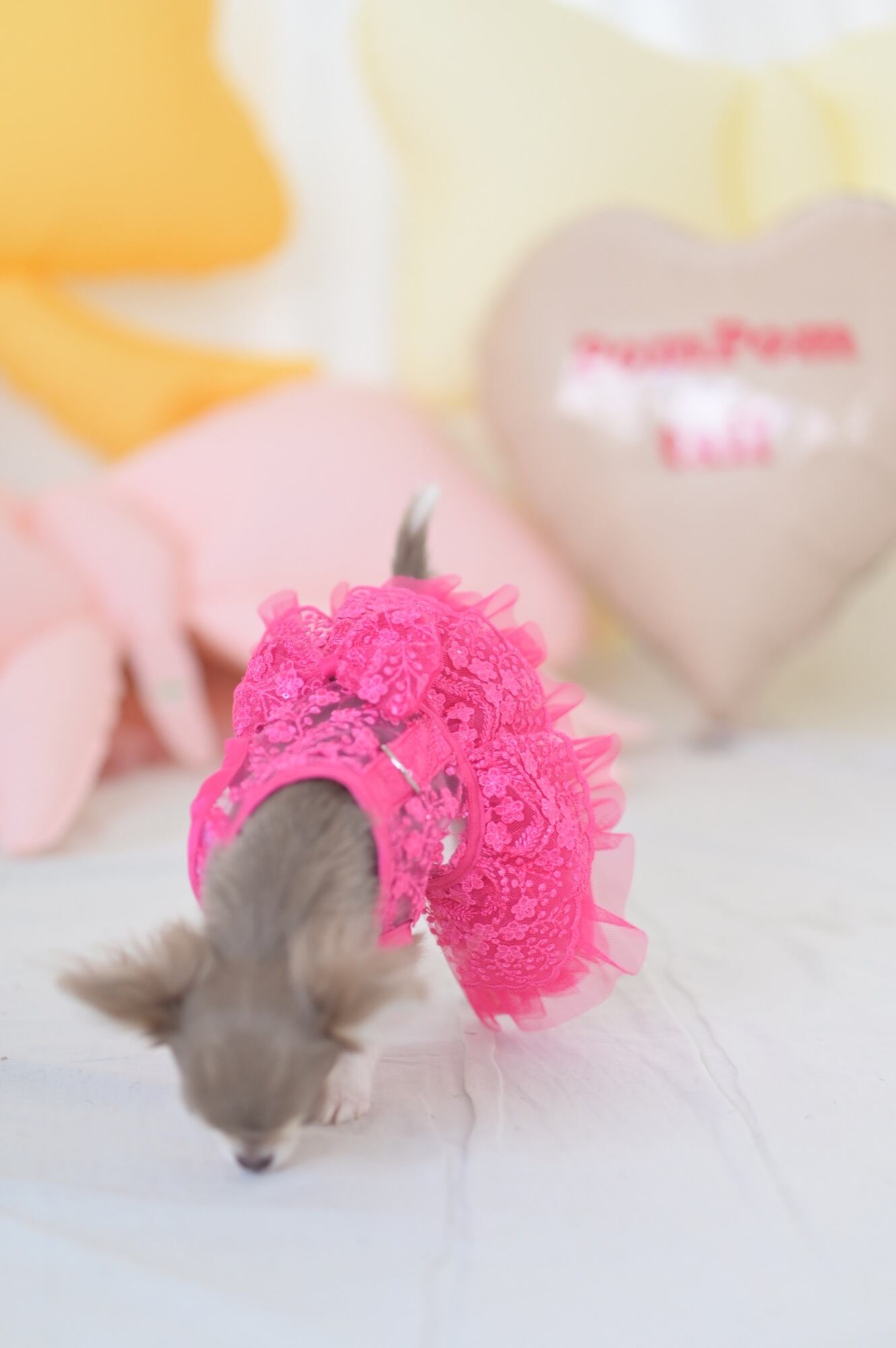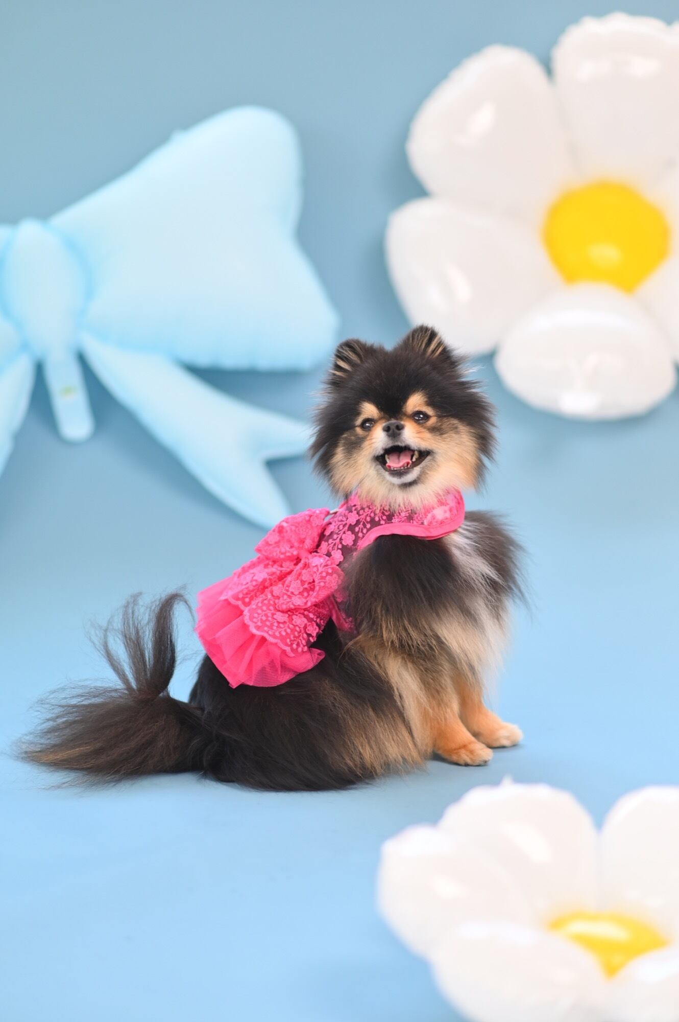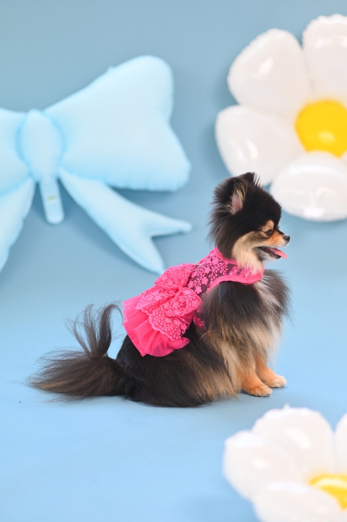 華やかさと気品を兼ね備えた唯一無二のスタイルで、真夏まで着こなせるシースルー刺繍メッシュと、鮮やかで目を引くビビットピンクカラーが、愛犬の可愛らしさを最大限に引き立てます。
