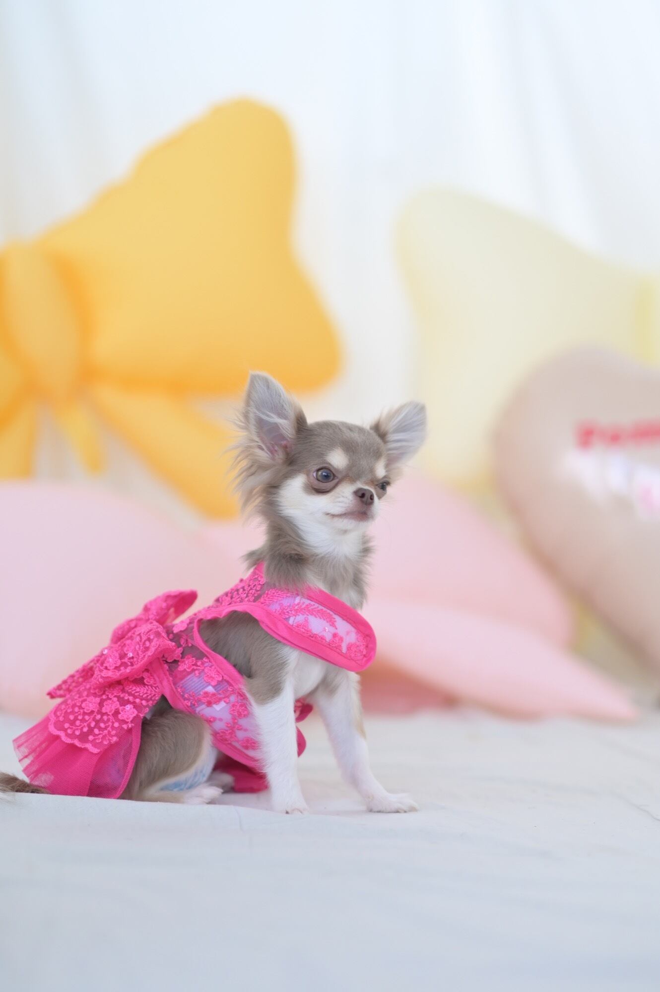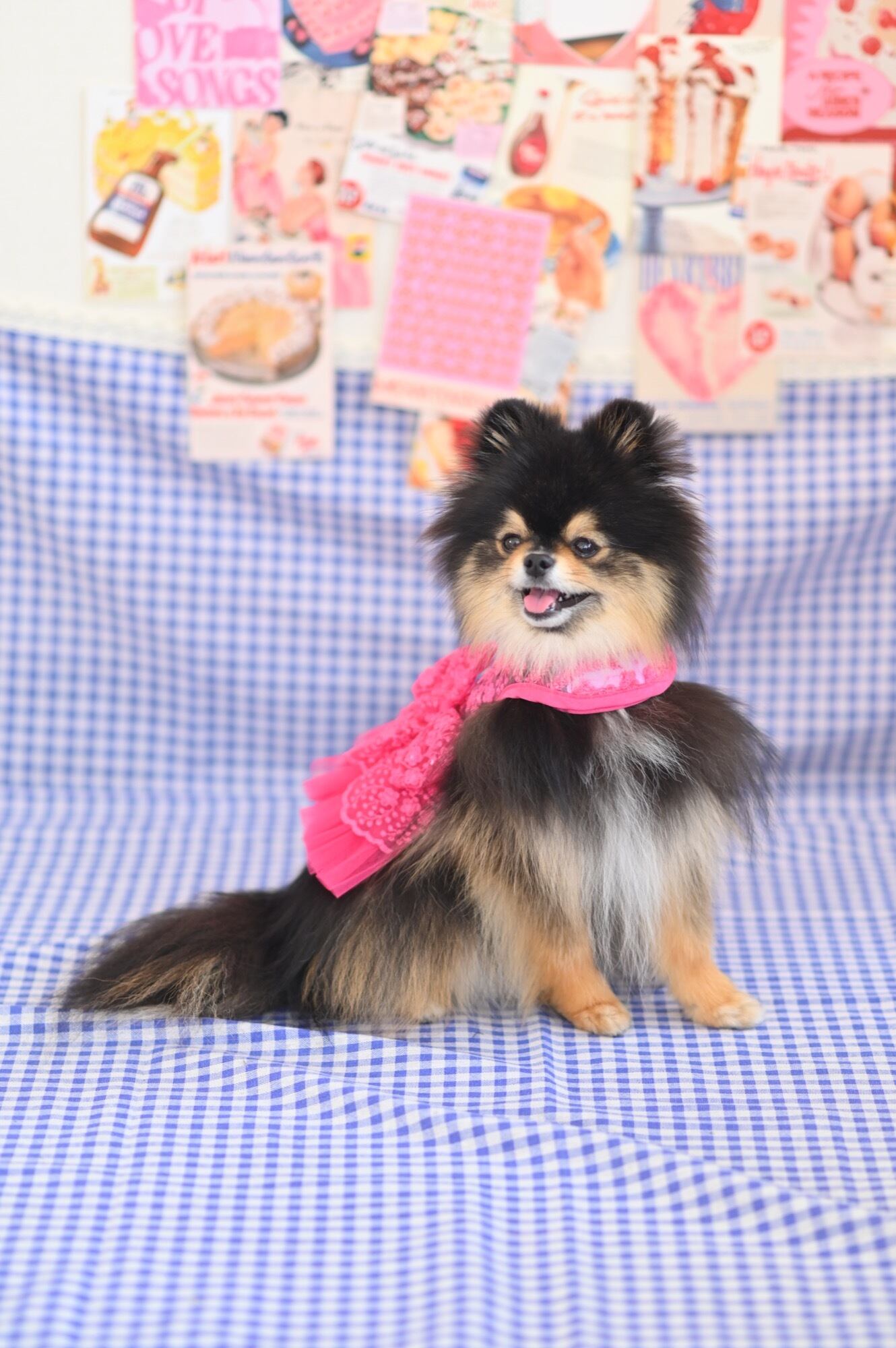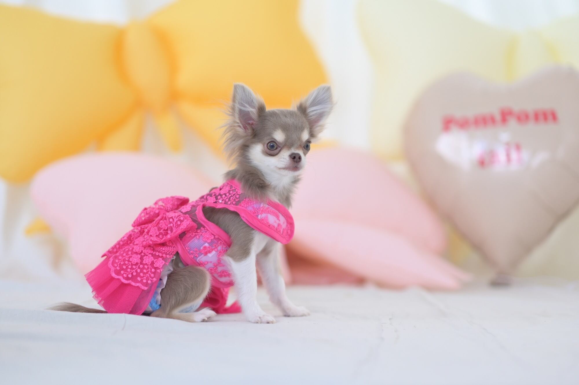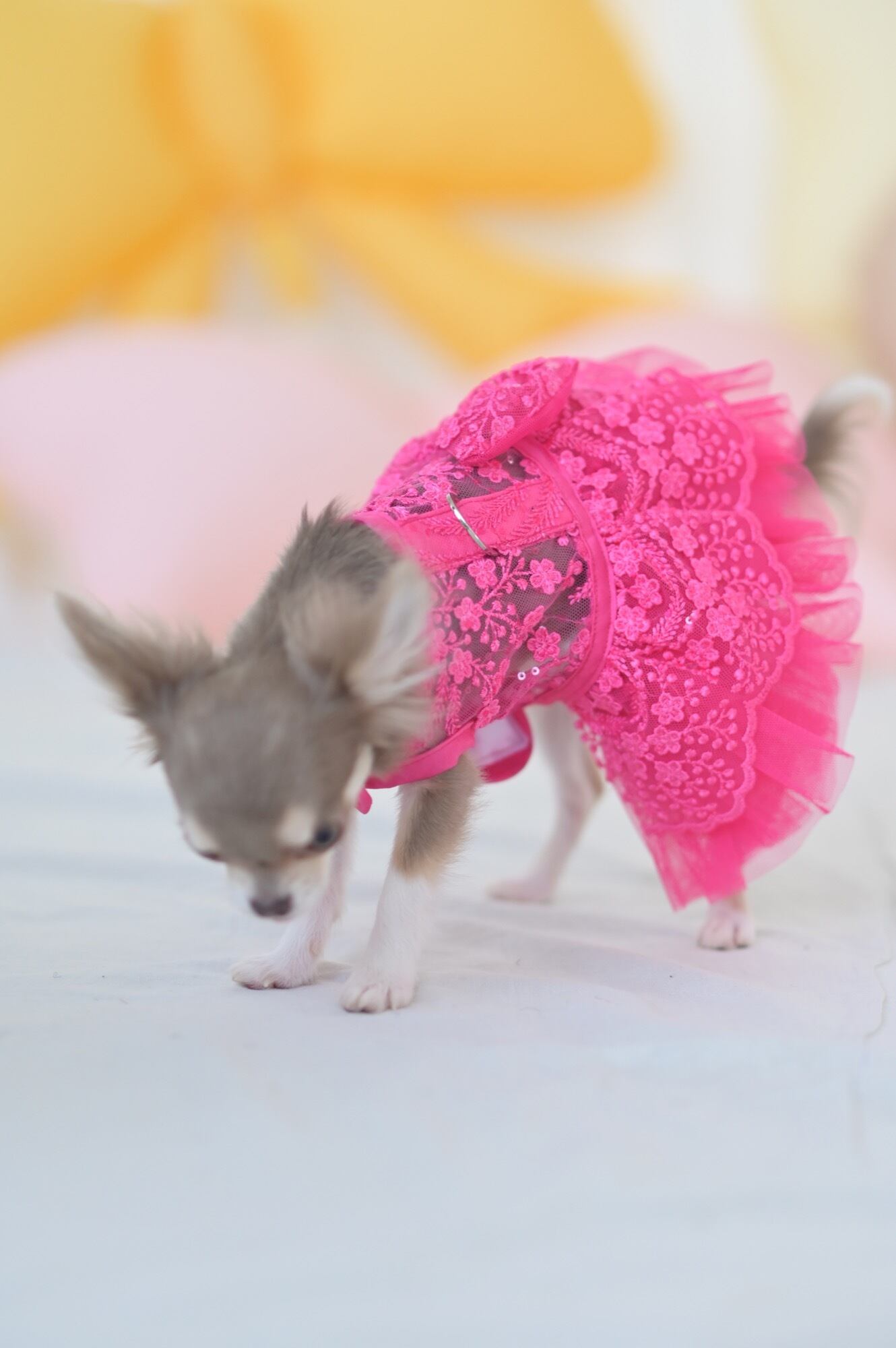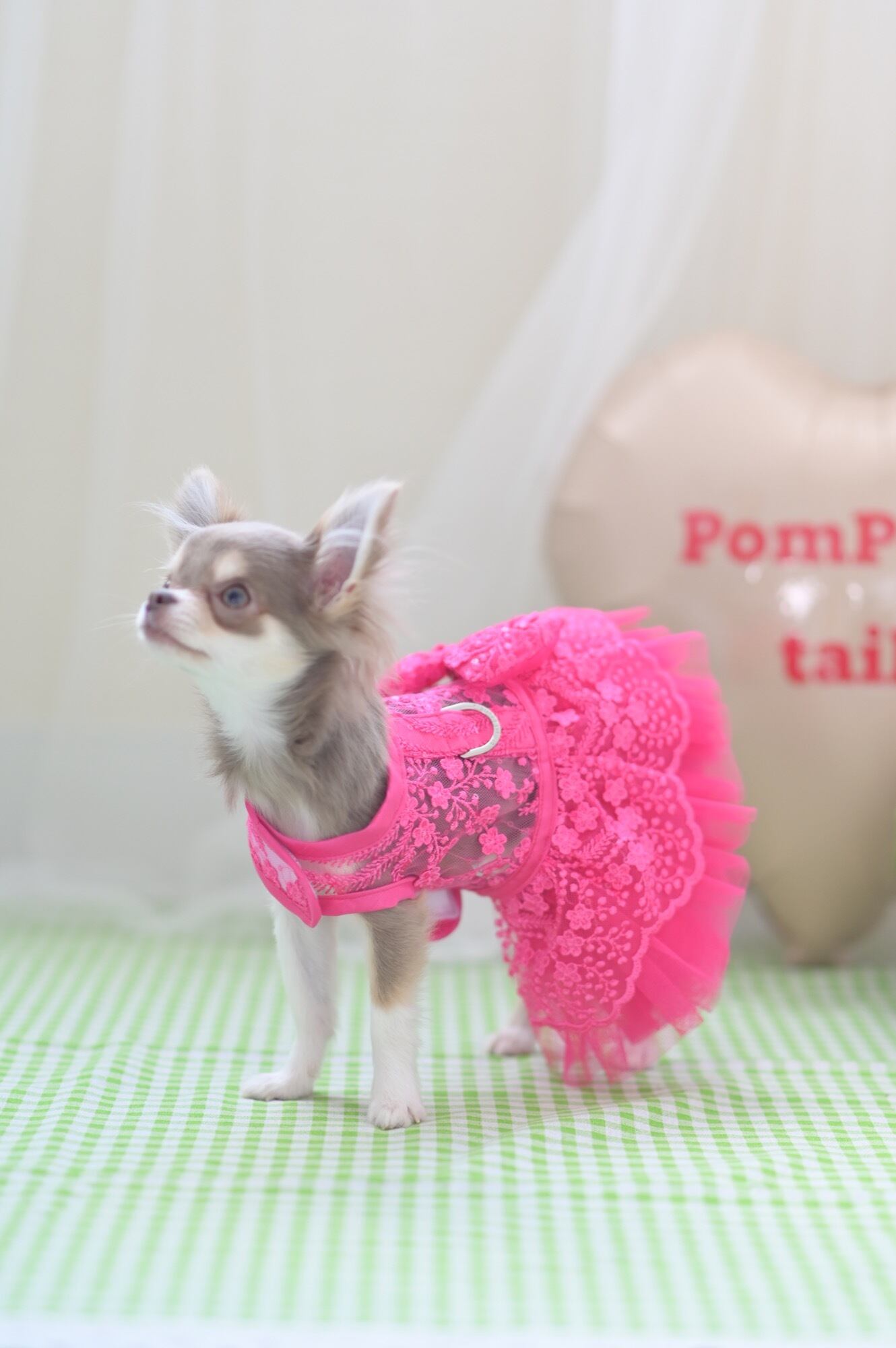 華やかさと気品を兼ね備えた唯一無二のスタイルで、真夏まで着こなせるシースルー刺繍メッシュと、鮮やかで目を引くビビットピンクカラーが、愛犬の可愛らしさを最大限に引き立てます。