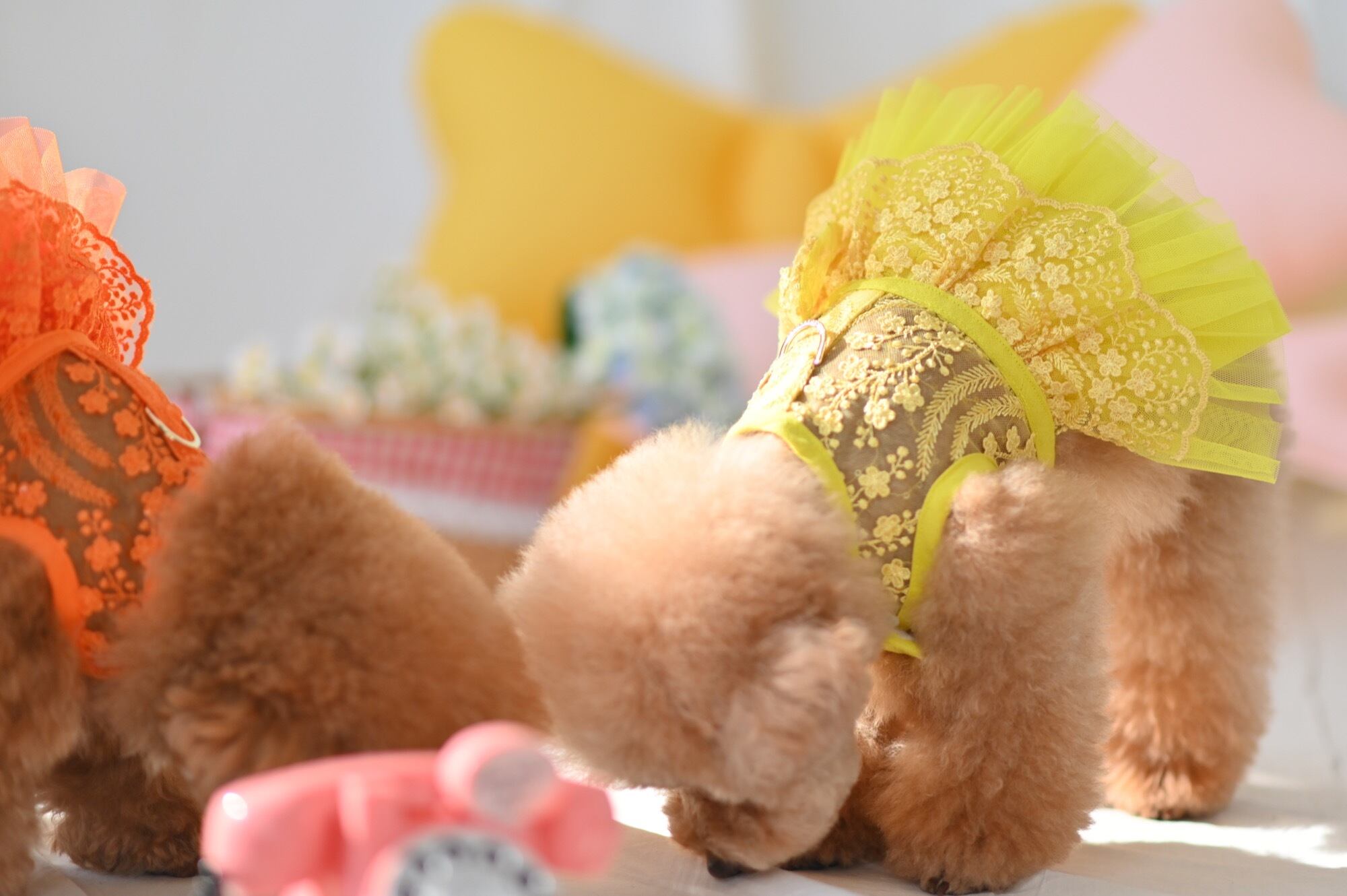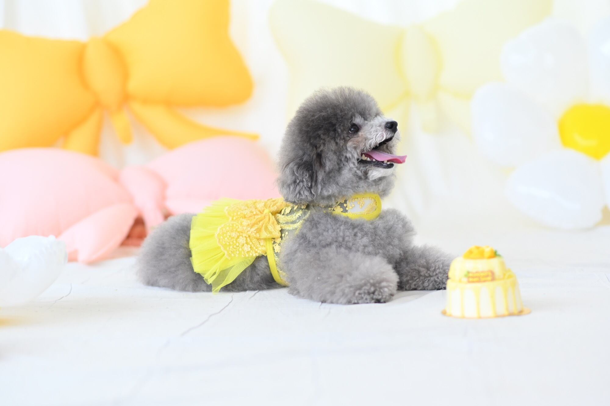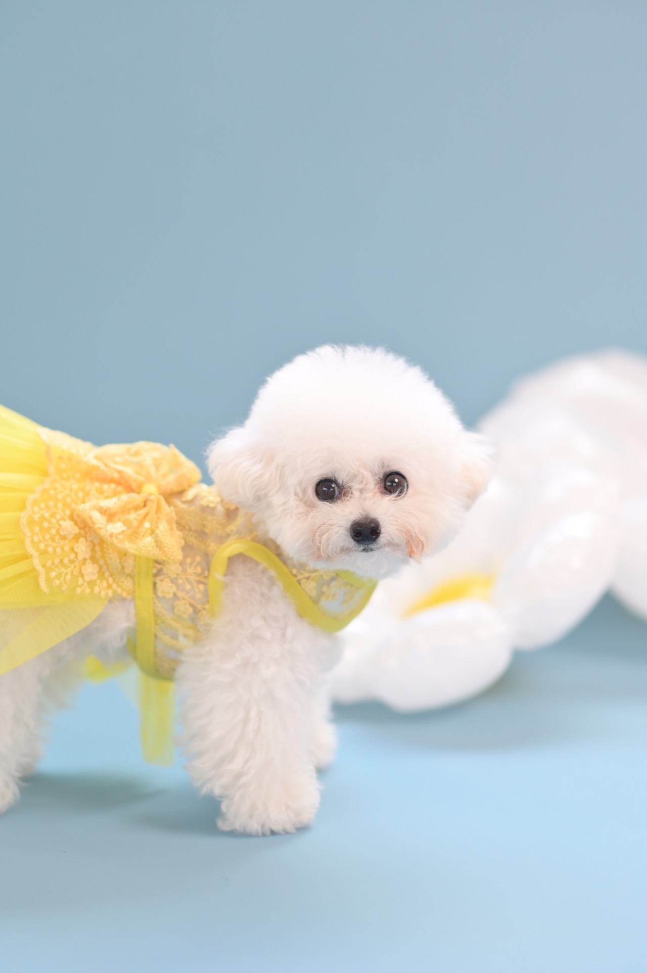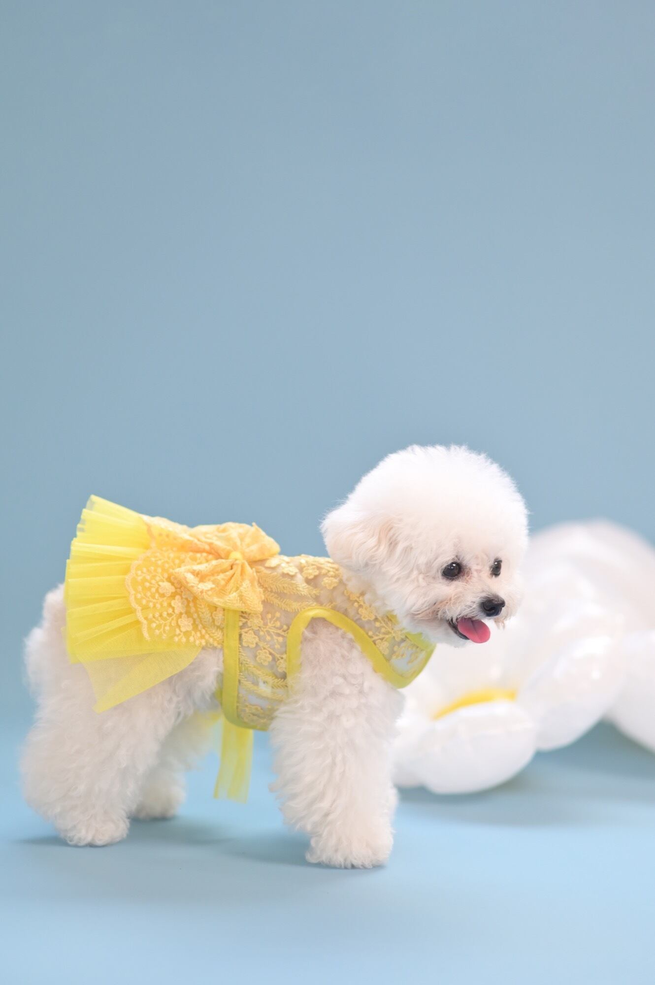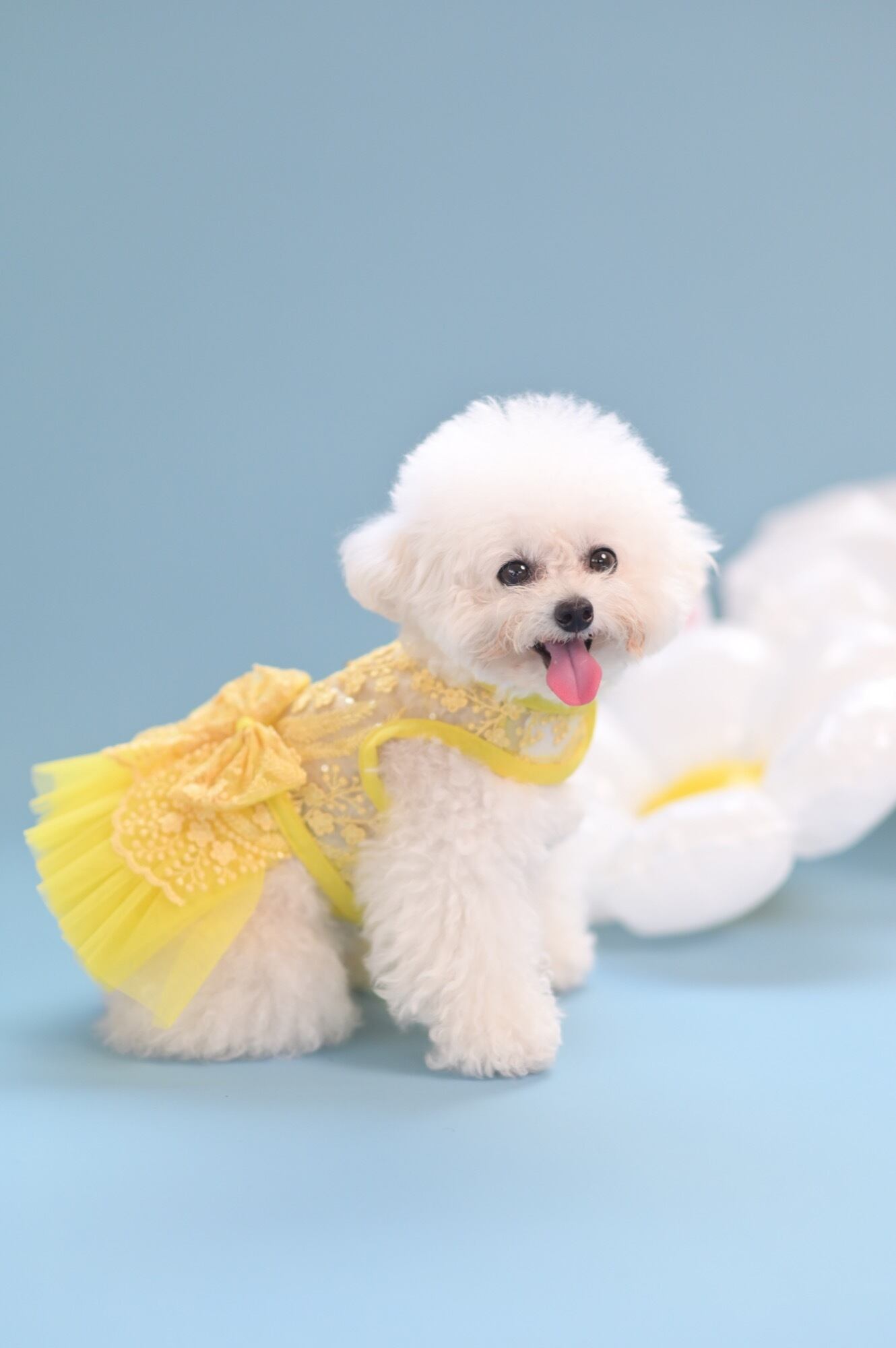 華やかさと気品を兼ね備えた唯一無二のスタイルで、真夏まで着こなせるシースルー刺繍メッシュと、元気で明るい印象を与えるビビットイエローカラーが、愛犬の可愛らしさと存在感を一層引き立てます。