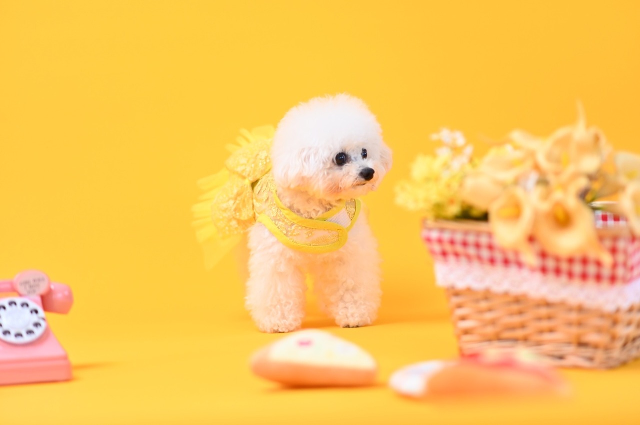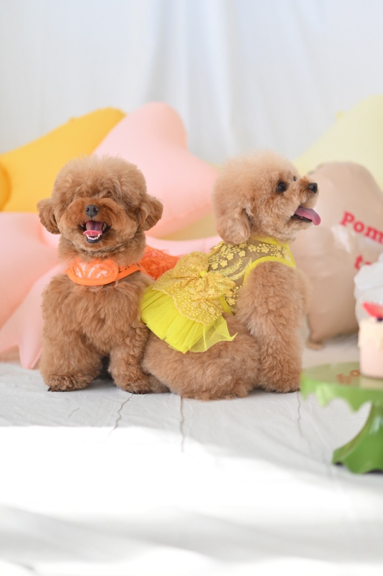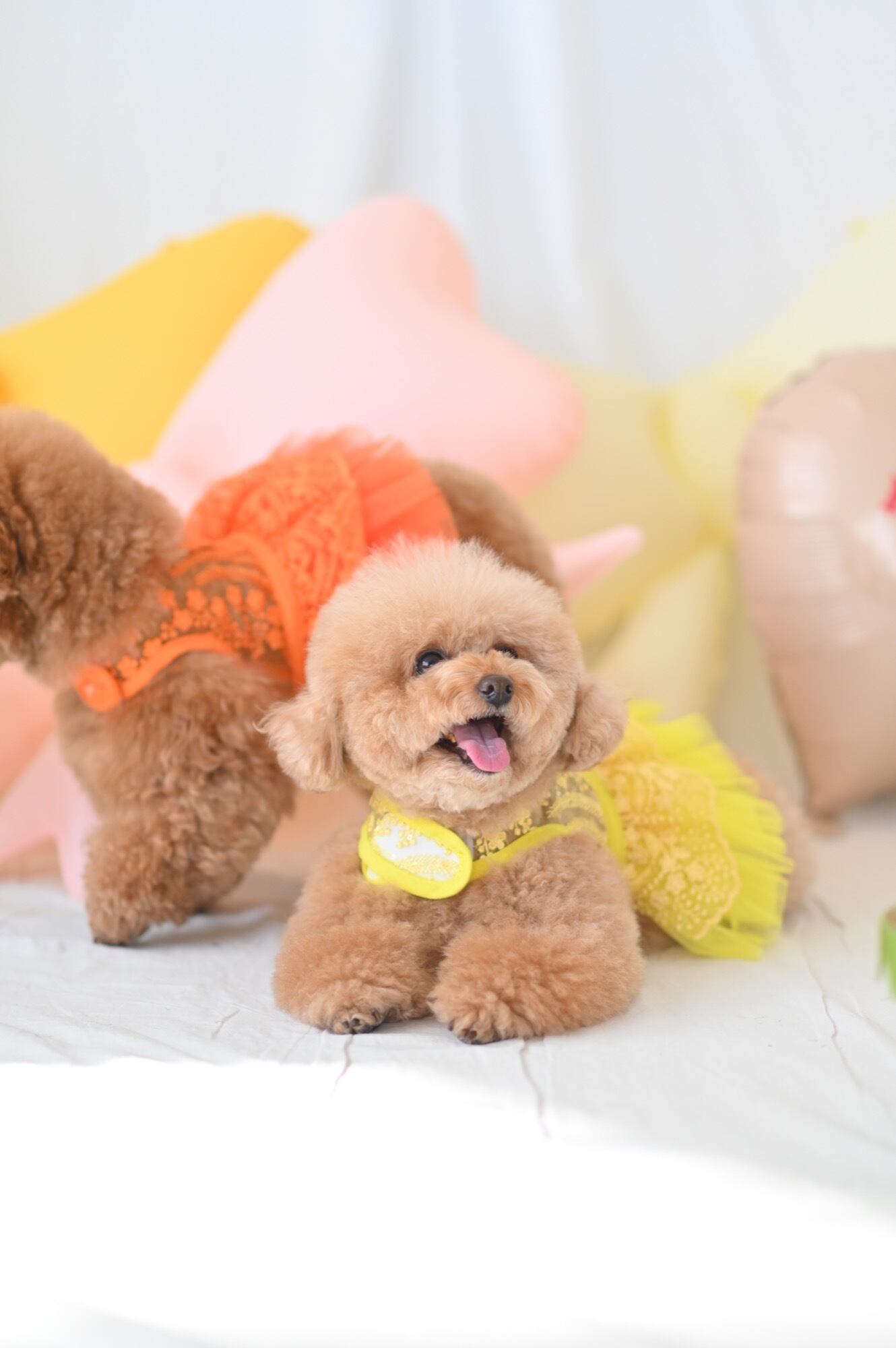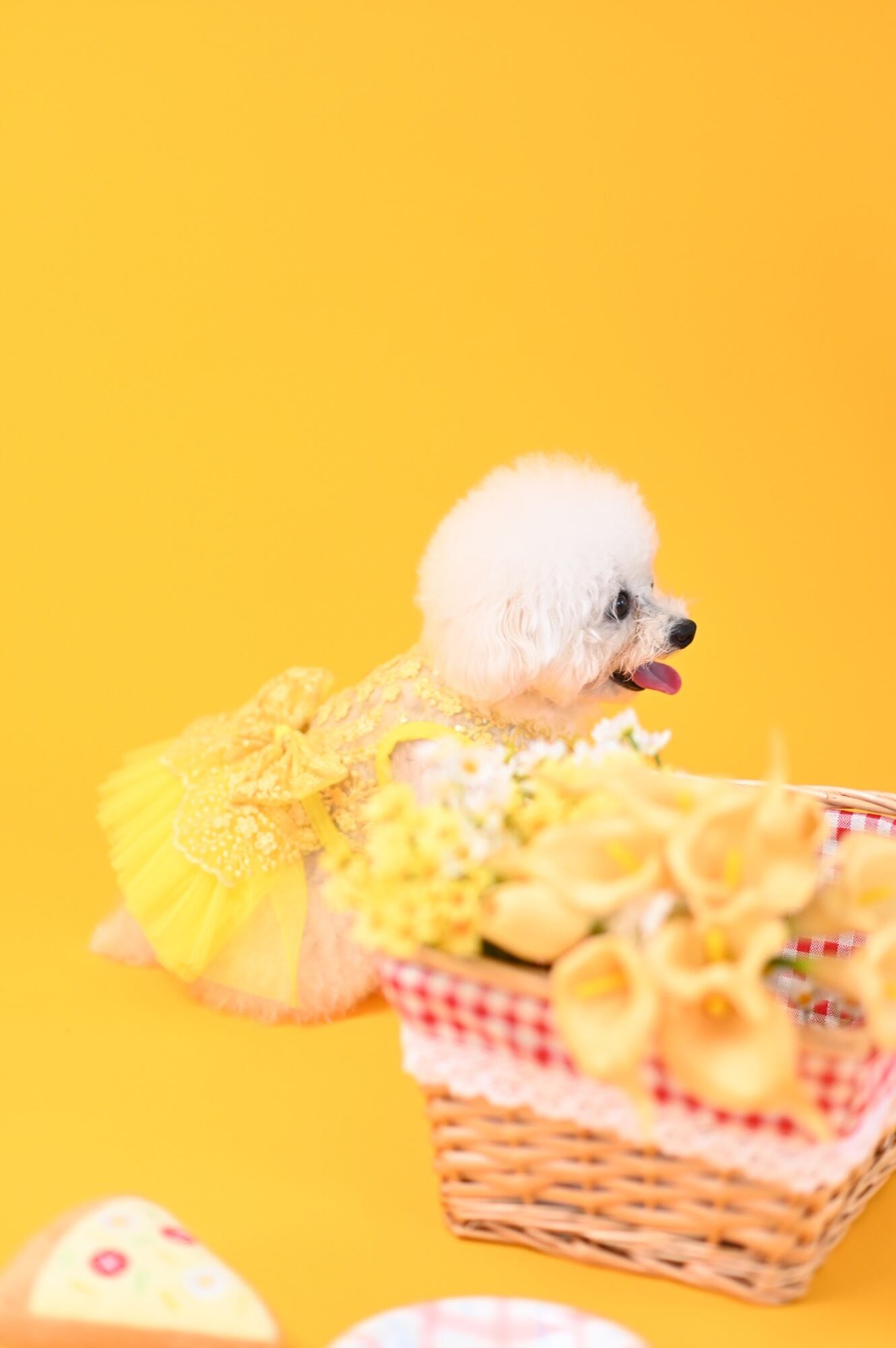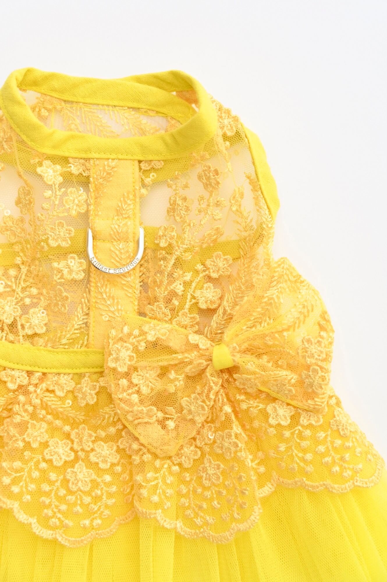 華やかさと気品を兼ね備えた唯一無二のスタイルで、真夏まで着こなせるシースルー刺繍メッシュと、元気で明るい印象を与えるビビットイエローカラーが、愛犬の可愛らしさと存在感を一層引き立てます。