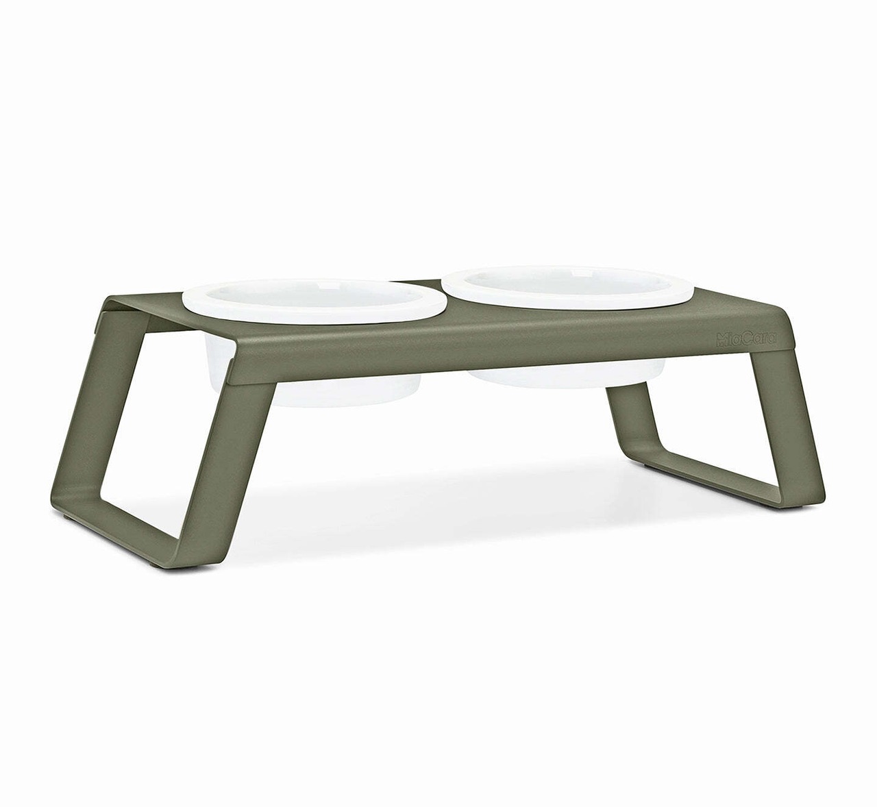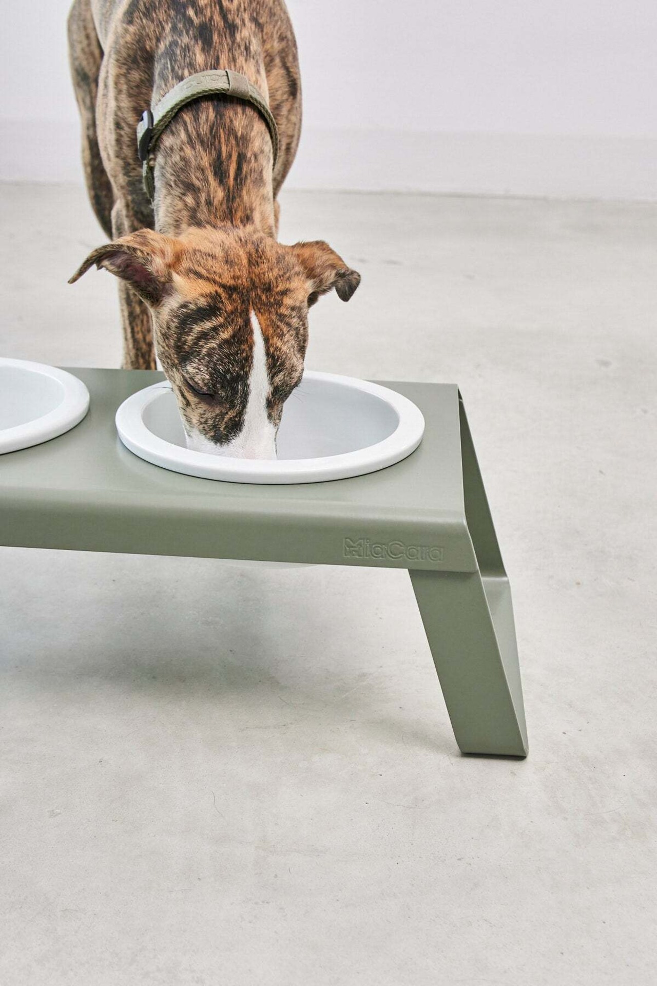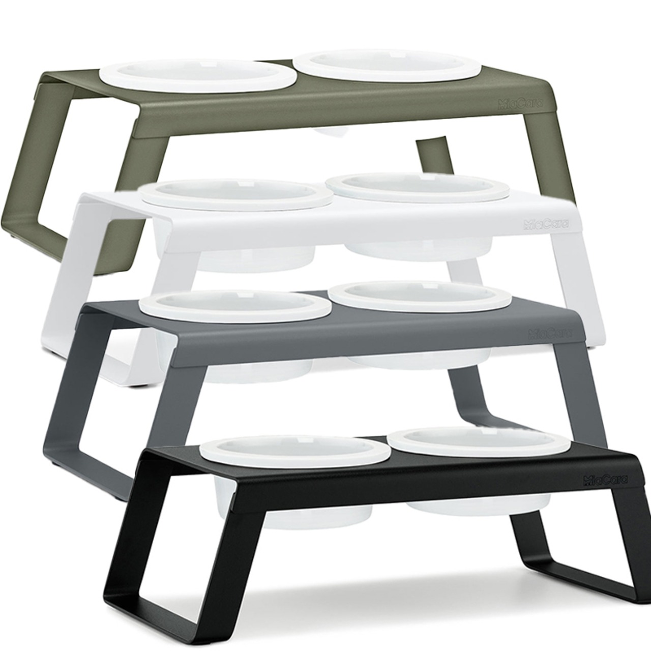 デザイナー Mathias De Ferm が MiaCara のために手がけた「Desco」は、パウダーコート仕上げのアルミフレームに、ドイツ製の高品質ポーセリンボウルを組み合わせたモダンなフードスタンドです。美しいフォルムと堅牢さを兼ね備え、愛犬とオーナーの両方を満足させます。