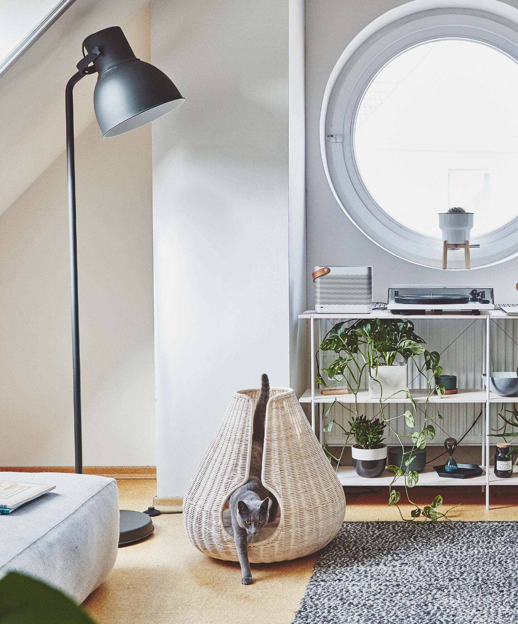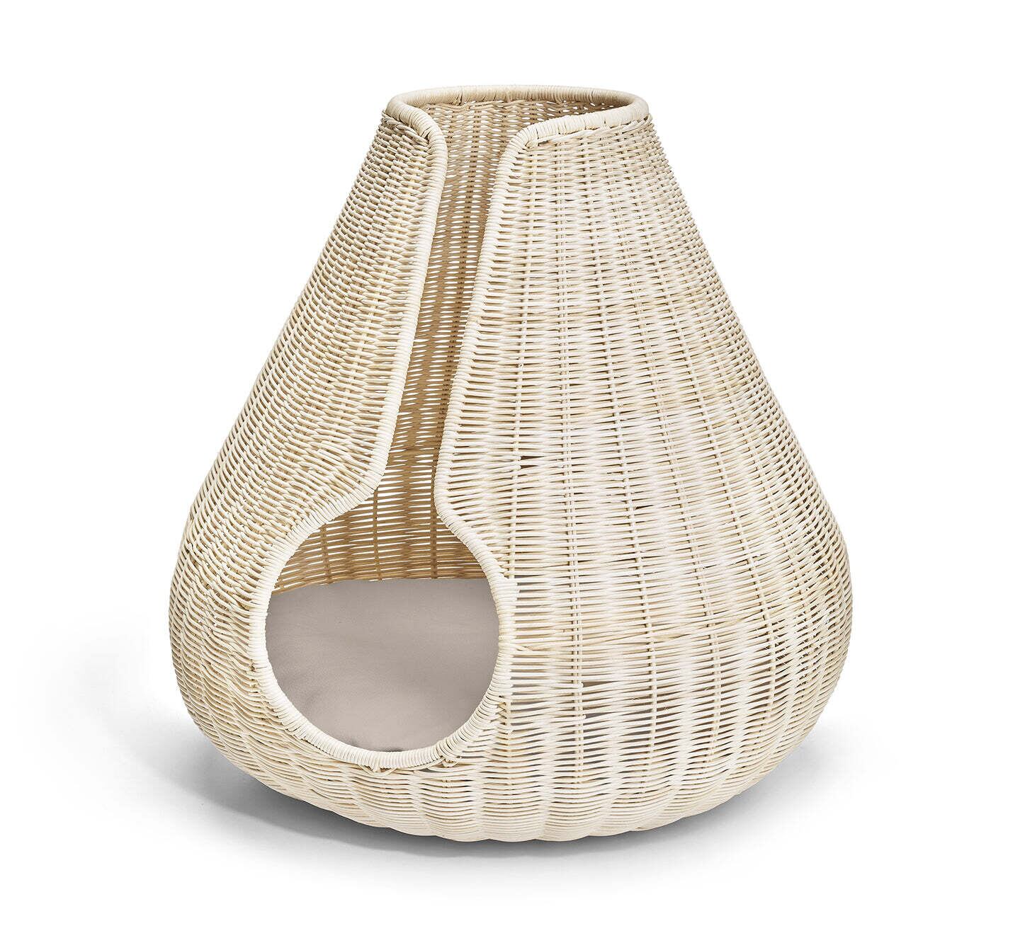 しずく型の曲線が特徴的なハンドメイドのキャットバスケットは、猫に安心感を与えつつ、通気性の良いロープや天然ラタンの編み込み構造で360°の視界を確保。屋内外どちらでも使用可能です。