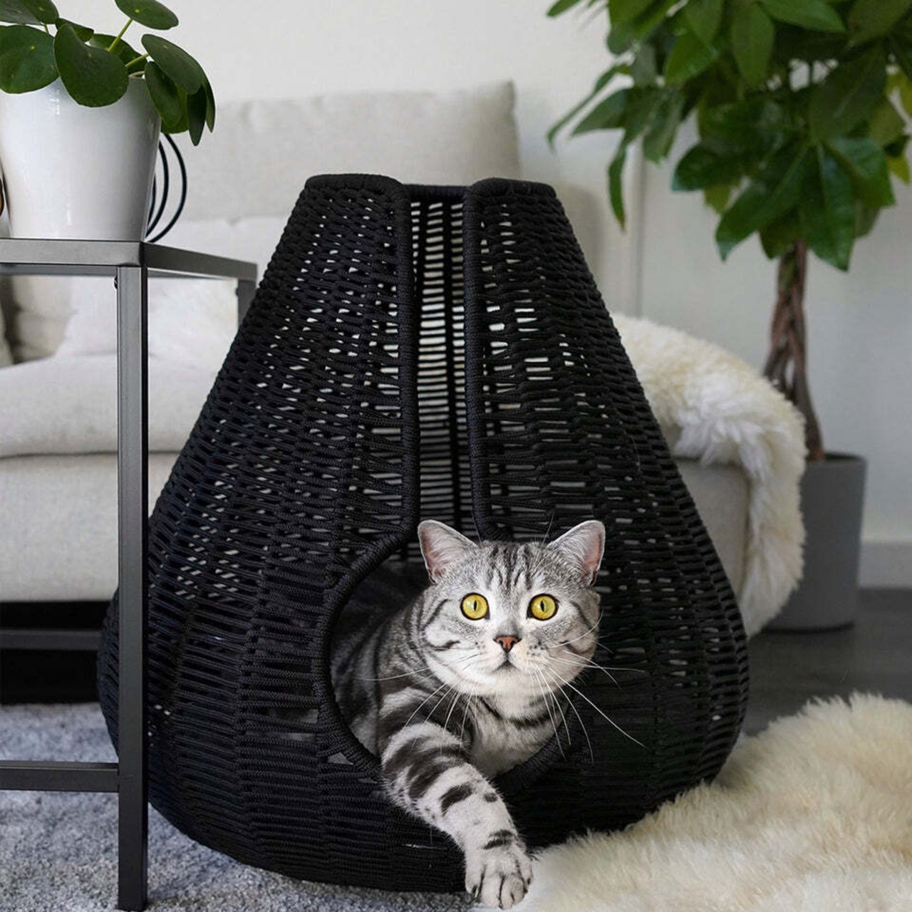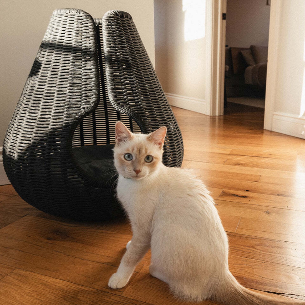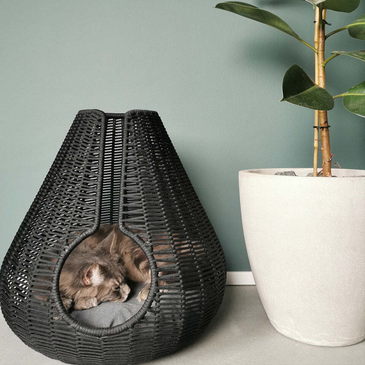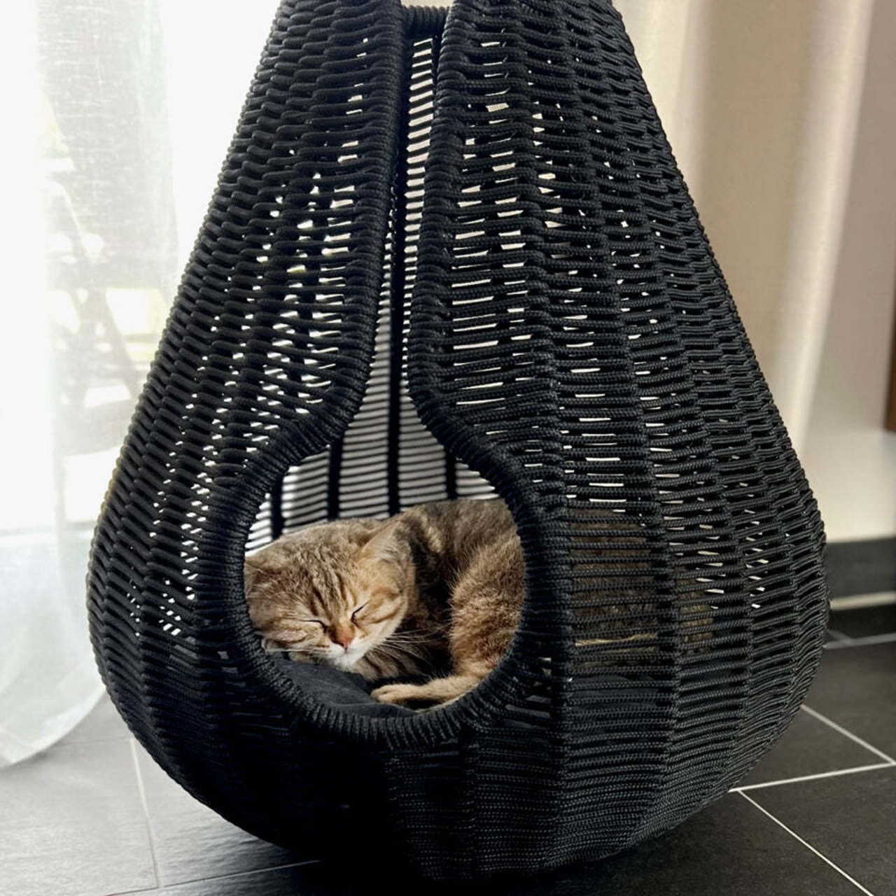 しずく型の曲線が特徴的なハンドメイドのキャットバスケットは、猫に安心感を与えつつ、通気性の良いロープや天然ラタンの編み込み構造で360°の視界を確保。屋内外どちらでも使用可能です。