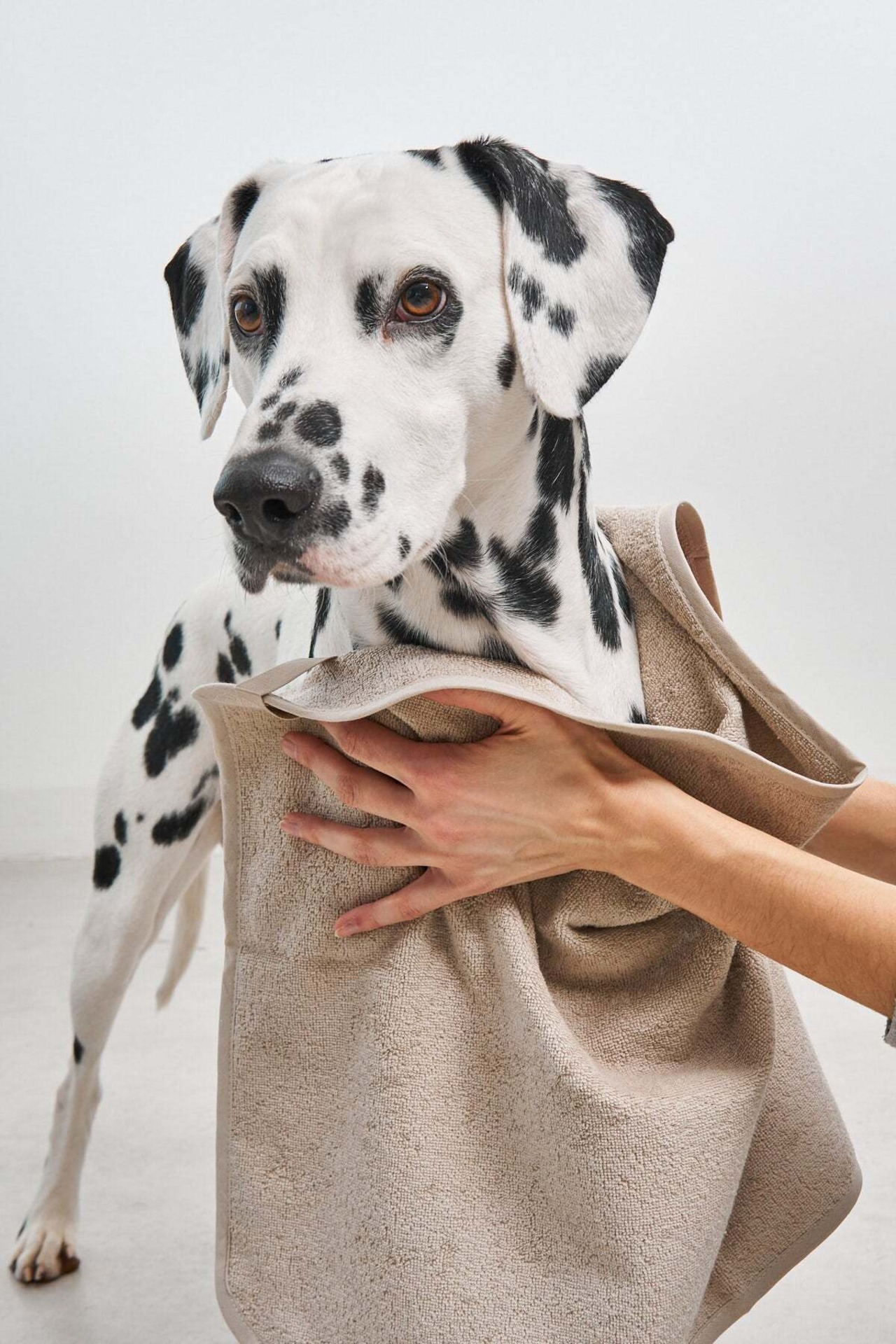やわらかなコットン製テリー生地が特徴で、表面だけでなく被毛の奥深く・アンダーコートの水分や汚れまでしっかりと吸収します。
