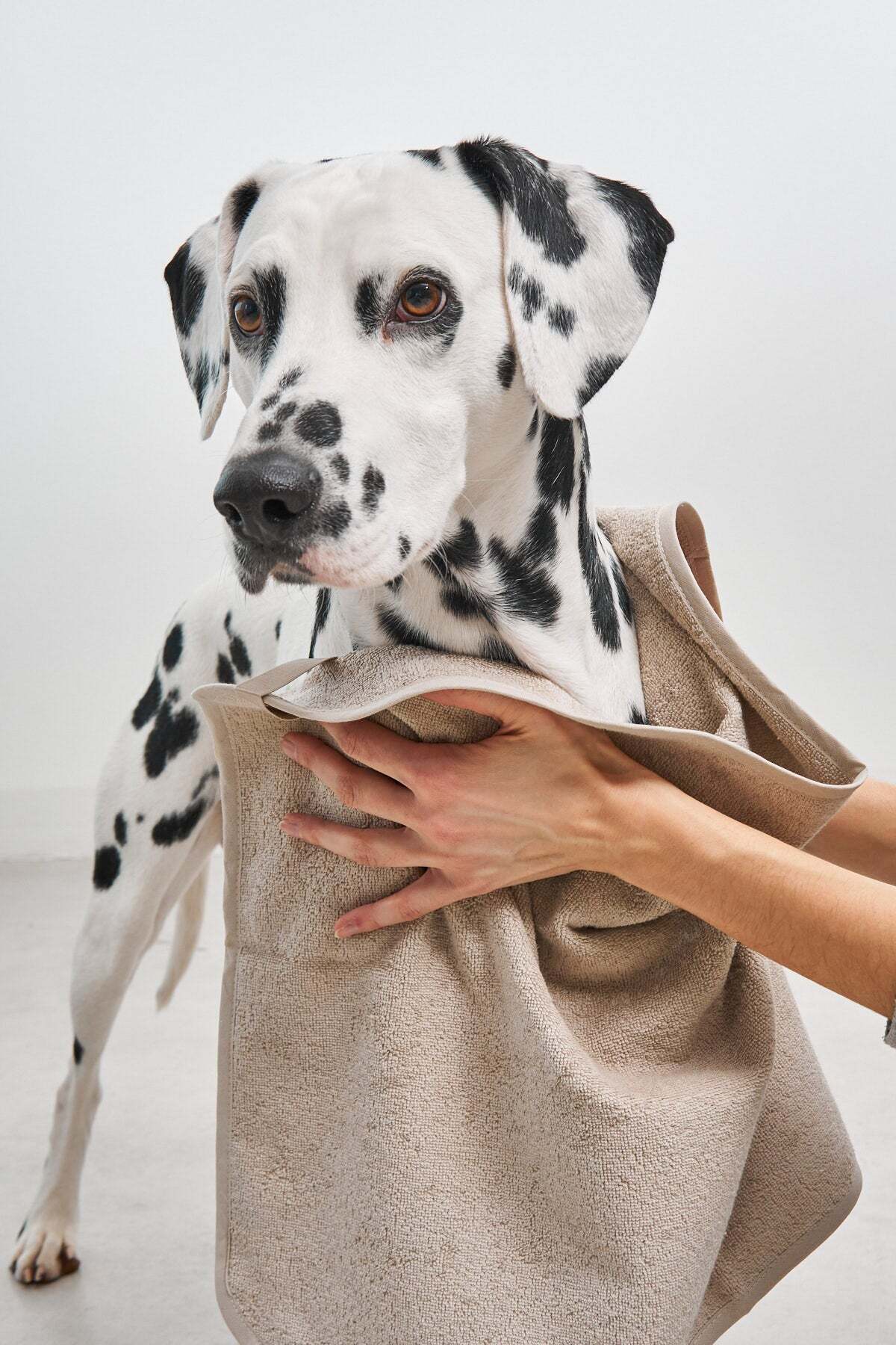 やわらかなコットン製テリー生地が特徴で、表面だけでなく被毛の奥深く・アンダーコートの水分や汚れまでしっかりと吸収します。