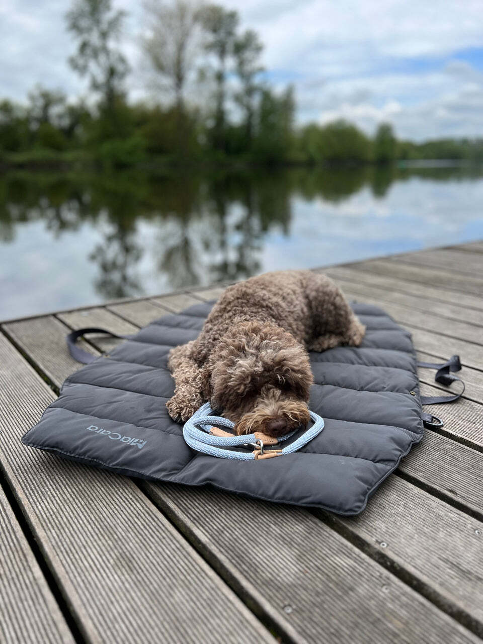 上面はキルティング加工によるふかふかのパッド入りで、旅先でもおうちのような快適さを提供。底面は水を弾くポリエステル素材でできており、地面からの湿気をシャットアウトします。素材には100%リサイクルされたPETボトルから作られたポリエステルを使用し、環境にも配慮しています。