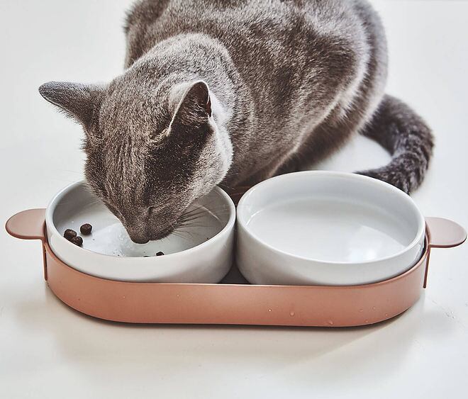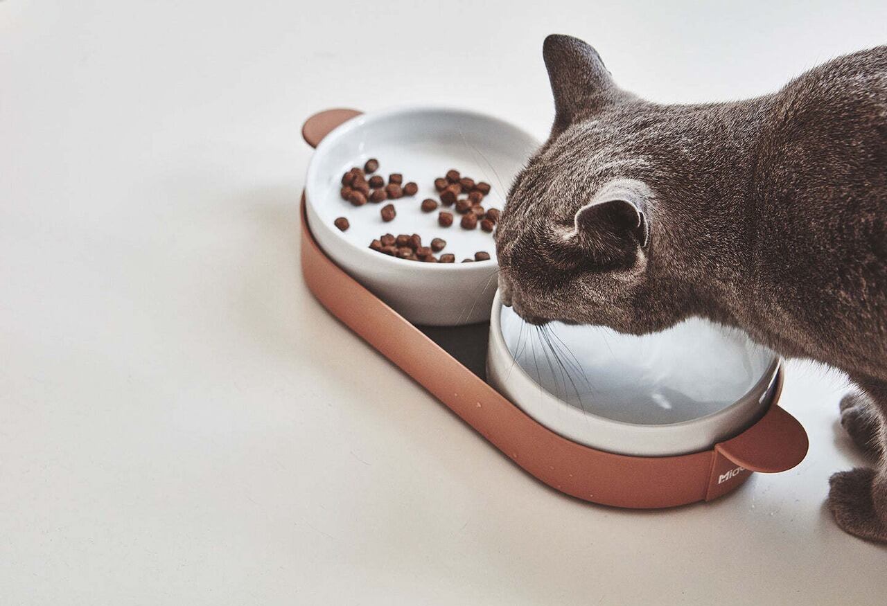パウダーコート加工のメタルトレイに収められた2つの高品質な磁器製ボウルは、食事とお水の両方に対応し、猫にとって安全かつ快適な食事時間を提供します。ボウルの下に敷かれた滑り止めマットがガタつきを防ぎ、音や動きを抑えて、繊細な猫もリラックスして食事ができる夫がされています。