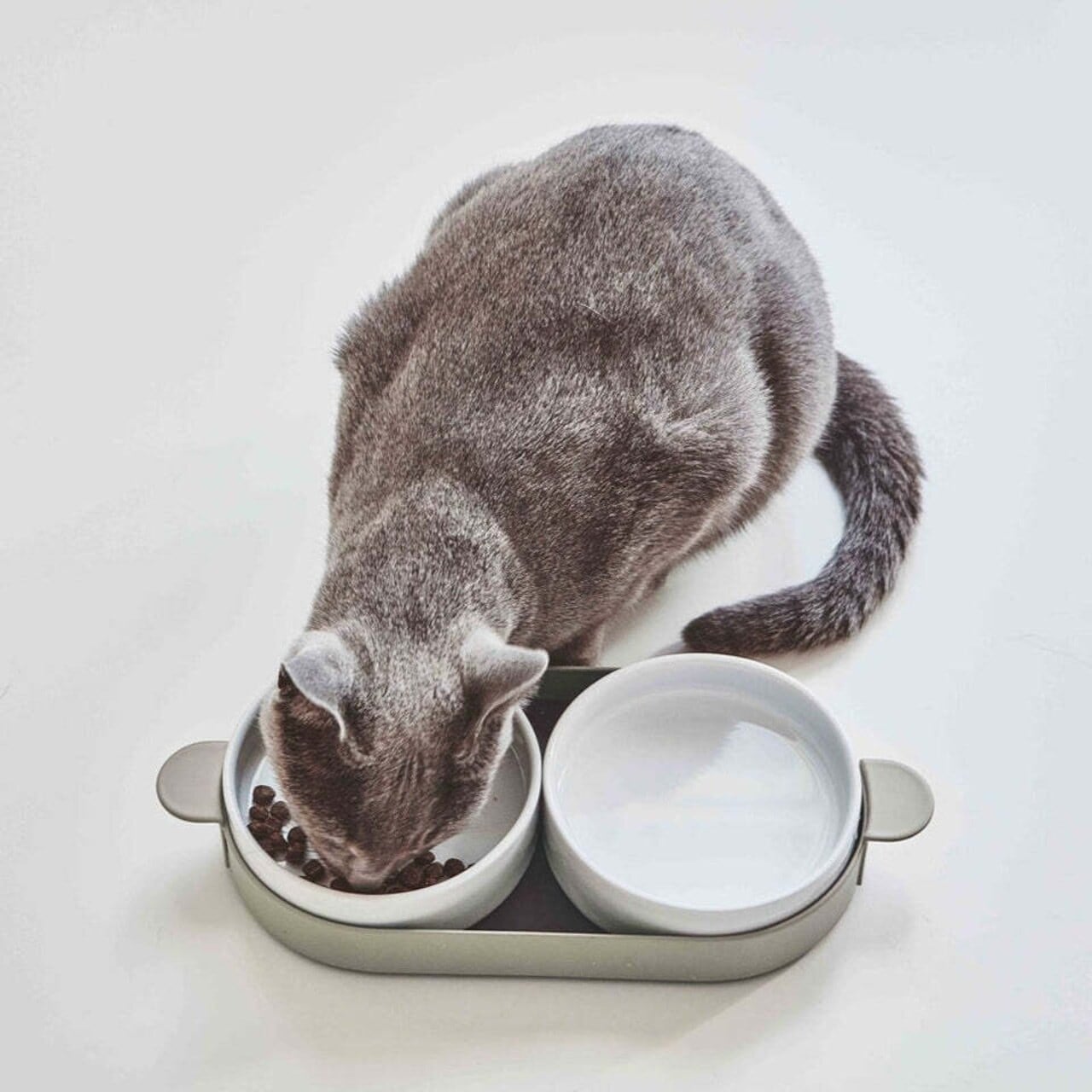 パウダーコート加工のメタルトレイに収められた2つの高品質な磁器製ボウルは、食事とお水の両方に対応し、猫にとって安全かつ快適な食事時間を提供します。ボウルの下に敷かれた滑り止めマットがガタつきを防ぎ、音や動きを抑えて、繊細な猫もリラックスして食事ができる夫がされています。