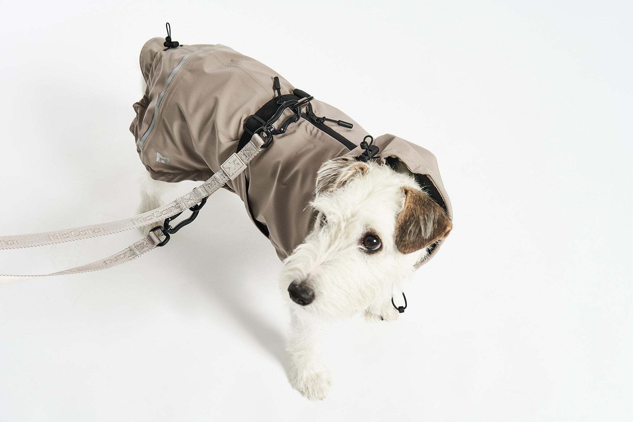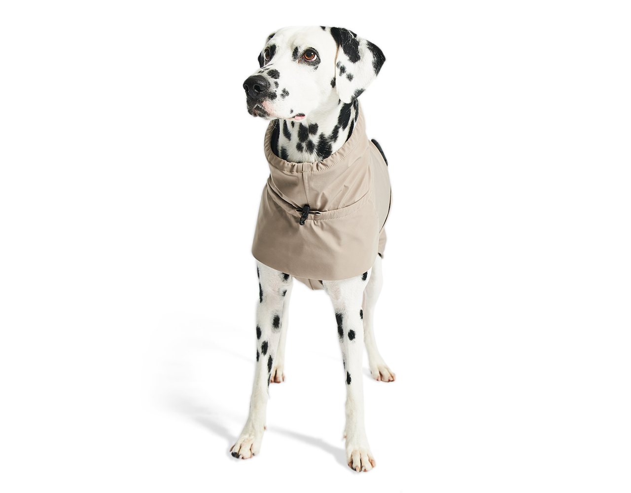 シックなサンドとコンクリートの2色展開で、都会的で洗練されたルックに。雨の日のマストアイテムとして、愛犬のワードローブにぜひ加えてください。