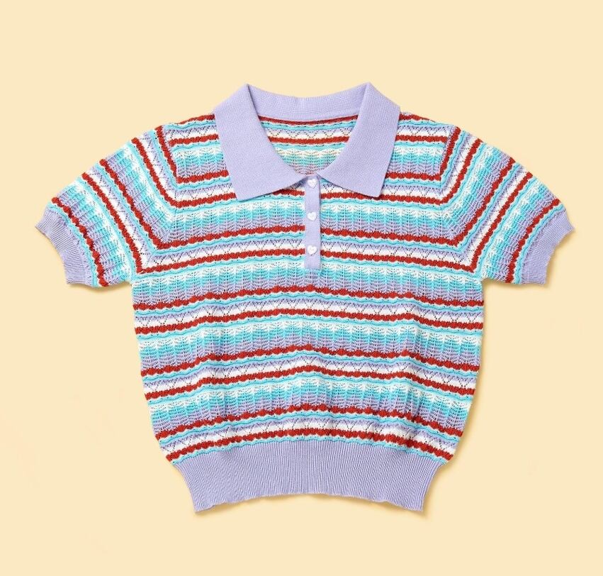 柔らかなラベンダーとパープルのストライプをあしらったショートスリーブポロは、通気性のよいクロシェ編みで仕立てられており、春夏のおでかけや愛犬とのお揃いコーデにぴったりです。