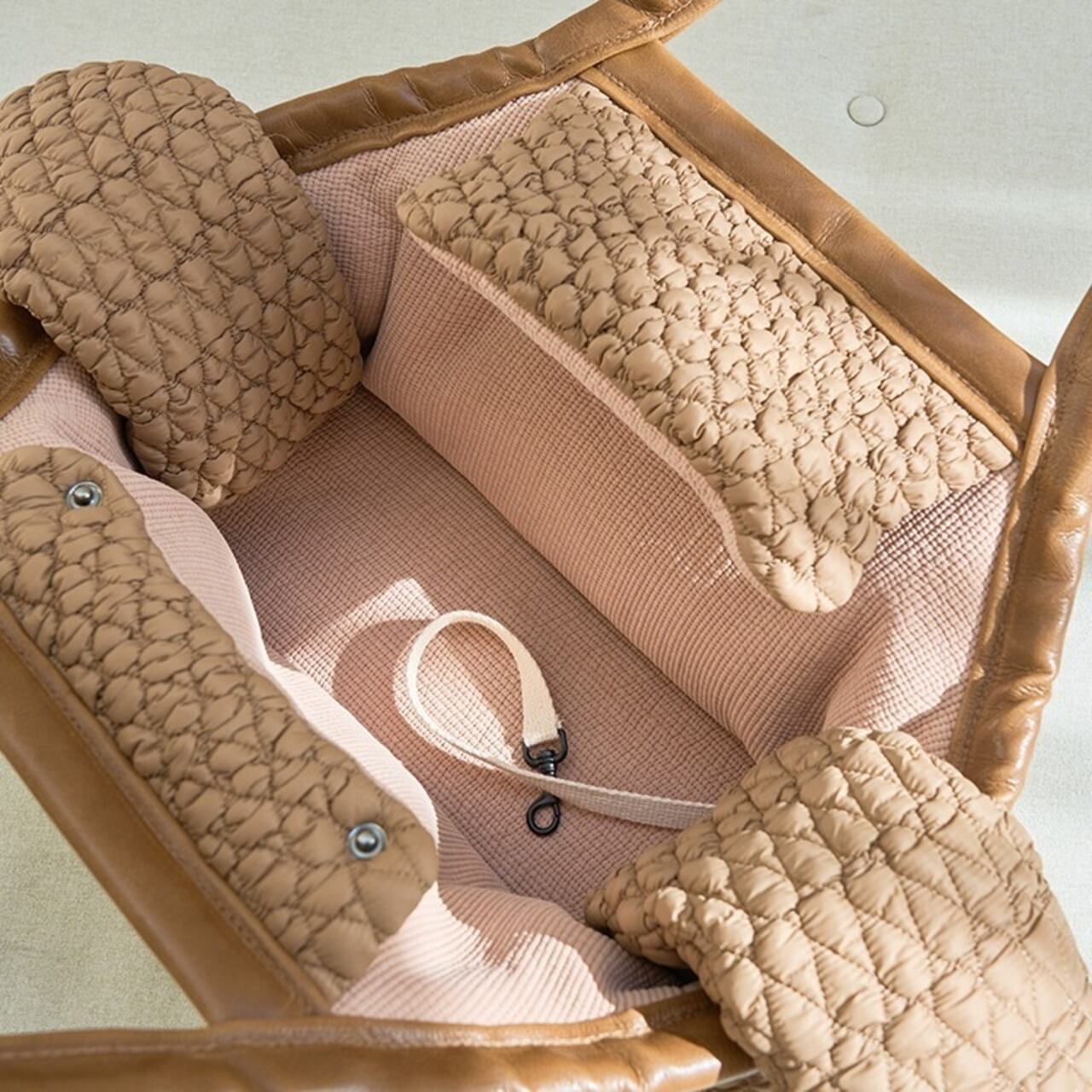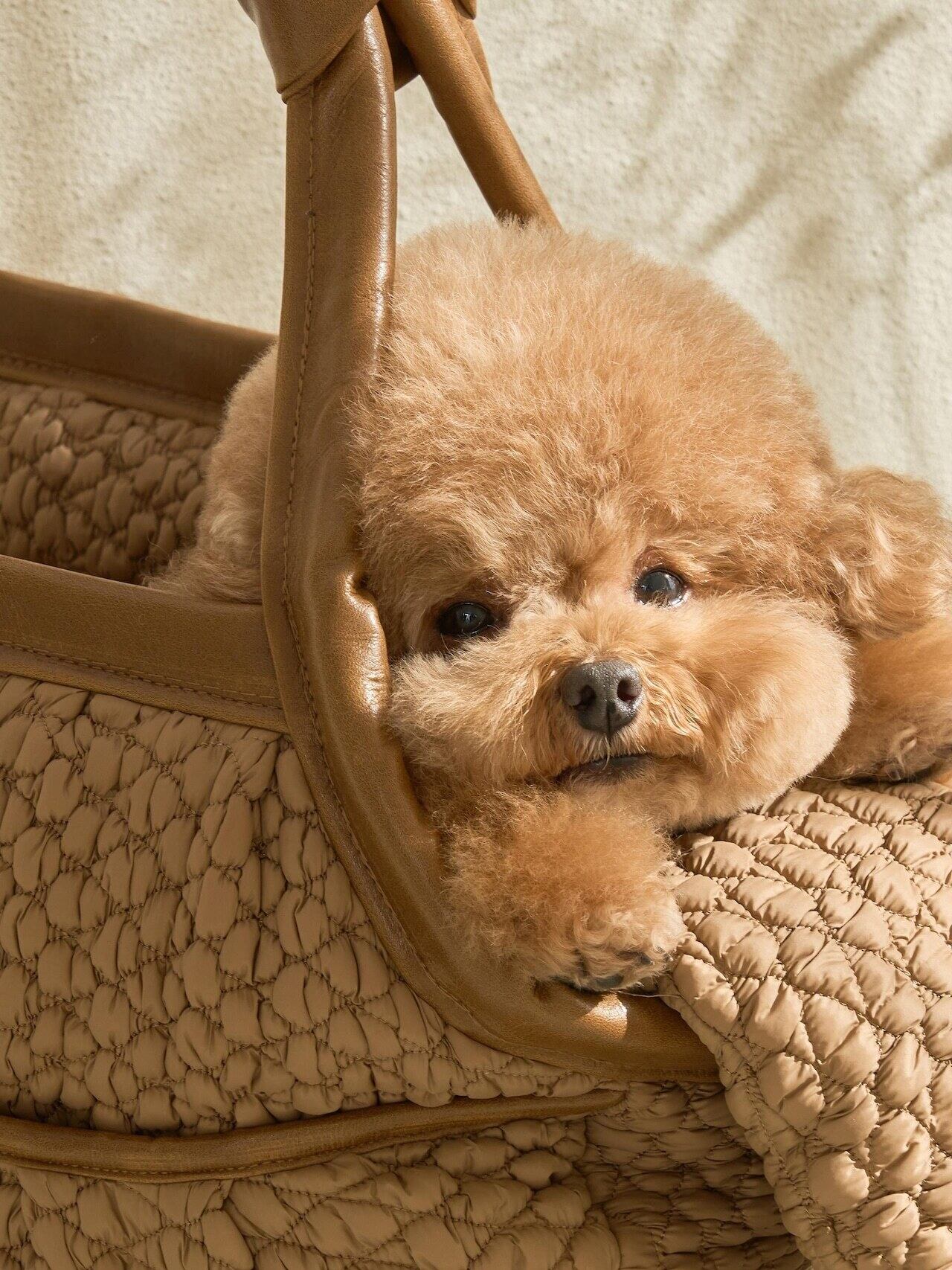 丈夫な構造で型崩れしにくく、愛犬を安心・快適に運べるキャリーバッグです。内部には仕切りがあり、お散歩やお出かけに必要な小物も整理して収納可能。軽量で持ち運びやすく、日常の外出や旅行にも最適です。