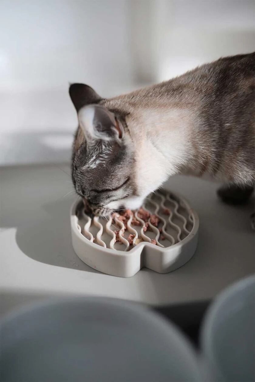 魚をモチーフにしたこの商品は、見た目のかわいさだけでなく、角やカーブ、さまざまな形状のなめ面によって、最後のひと口まで猫の好奇心と集中力を刺激します。
