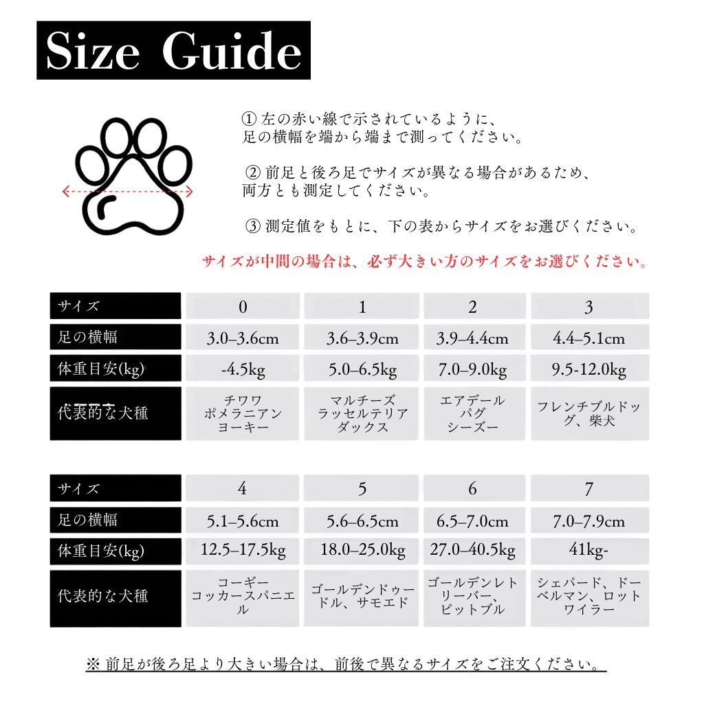 後ろ足のサイズのほうが小さい子も多いため、サイズをご確認の上、ご注文くださいませ。