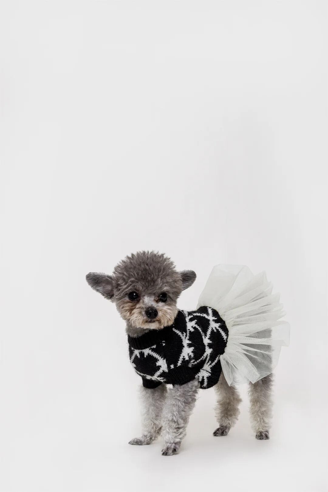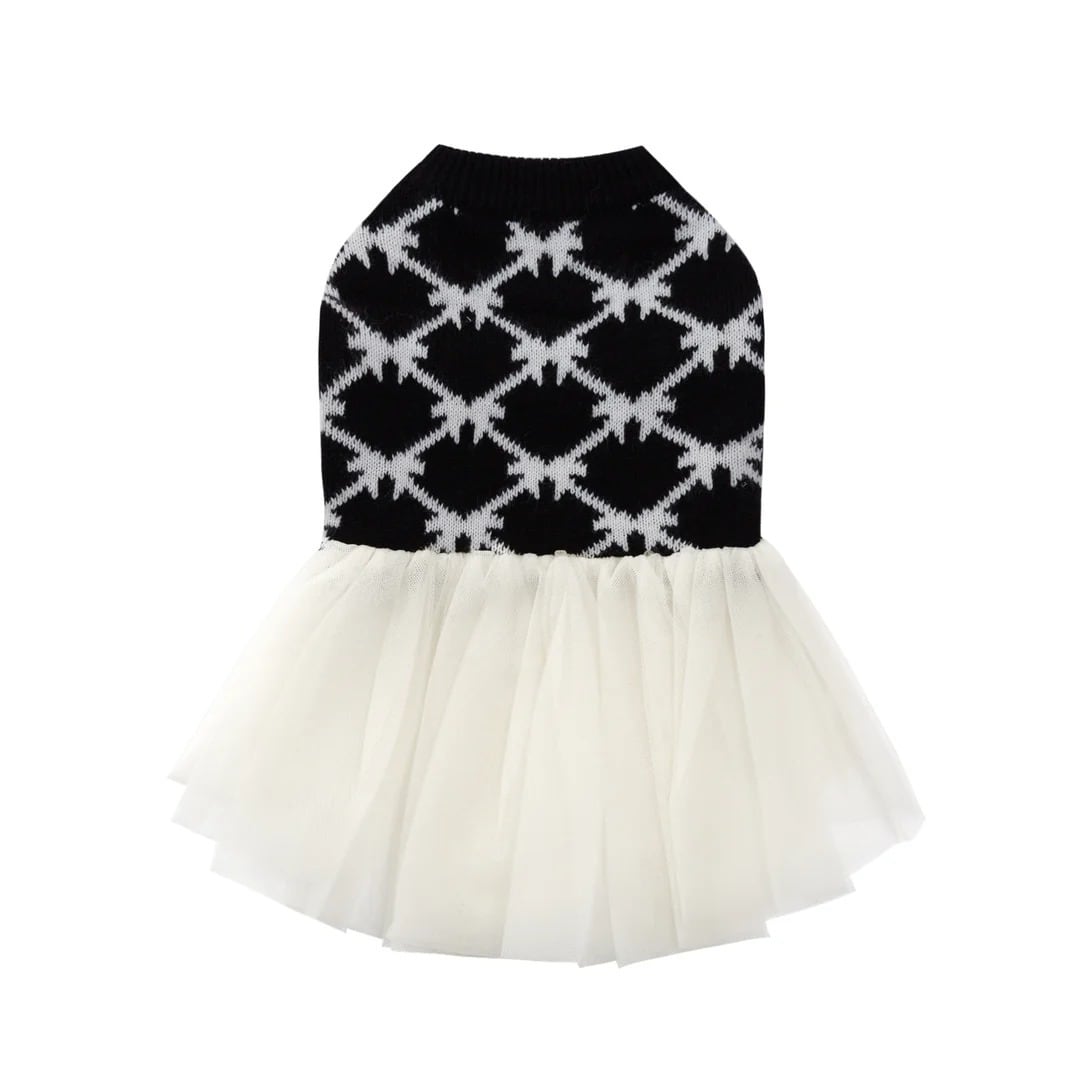 幾何学的なジャカード柄をあしらったニットトップスに、軽やかなチュールスカートをドッキングしたドレスライクな一着。